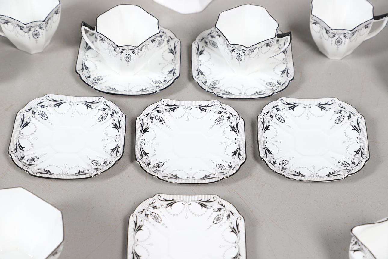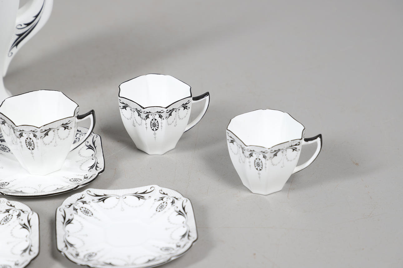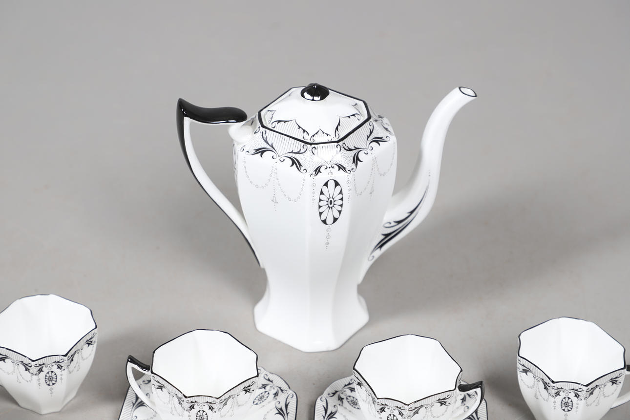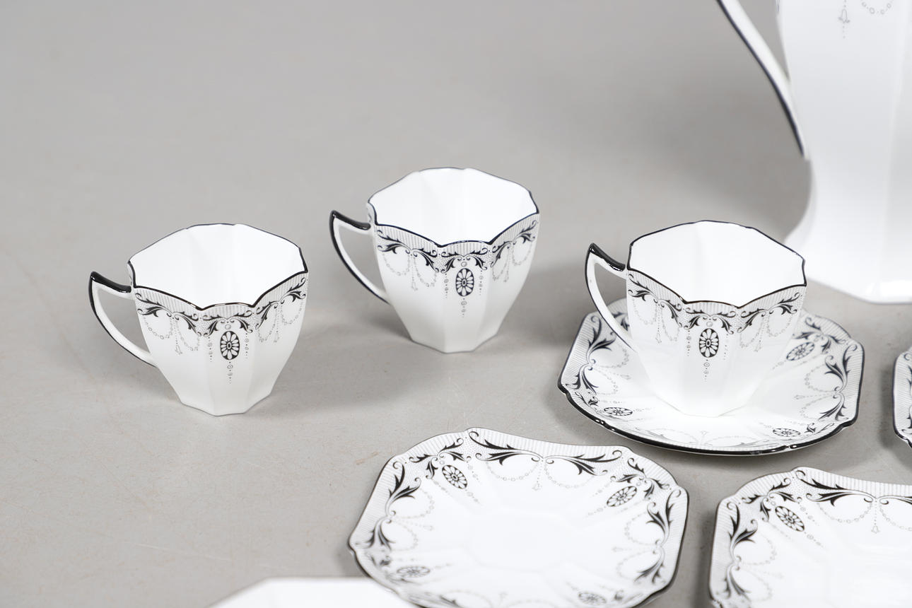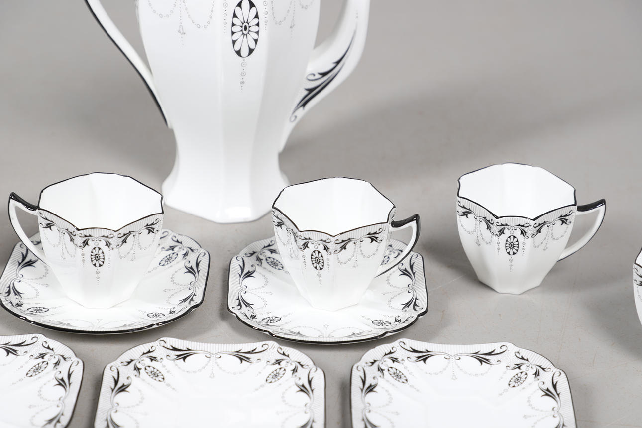 An art deco coffee set, pattern 11612 and in the Queen Anne shape. Comprising a coffee pot, milk jug and sugar bowl, 6 saucers and 6 cups. Coffee pot 19.5cms high.