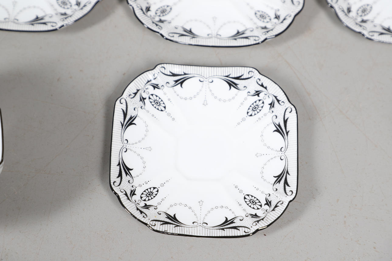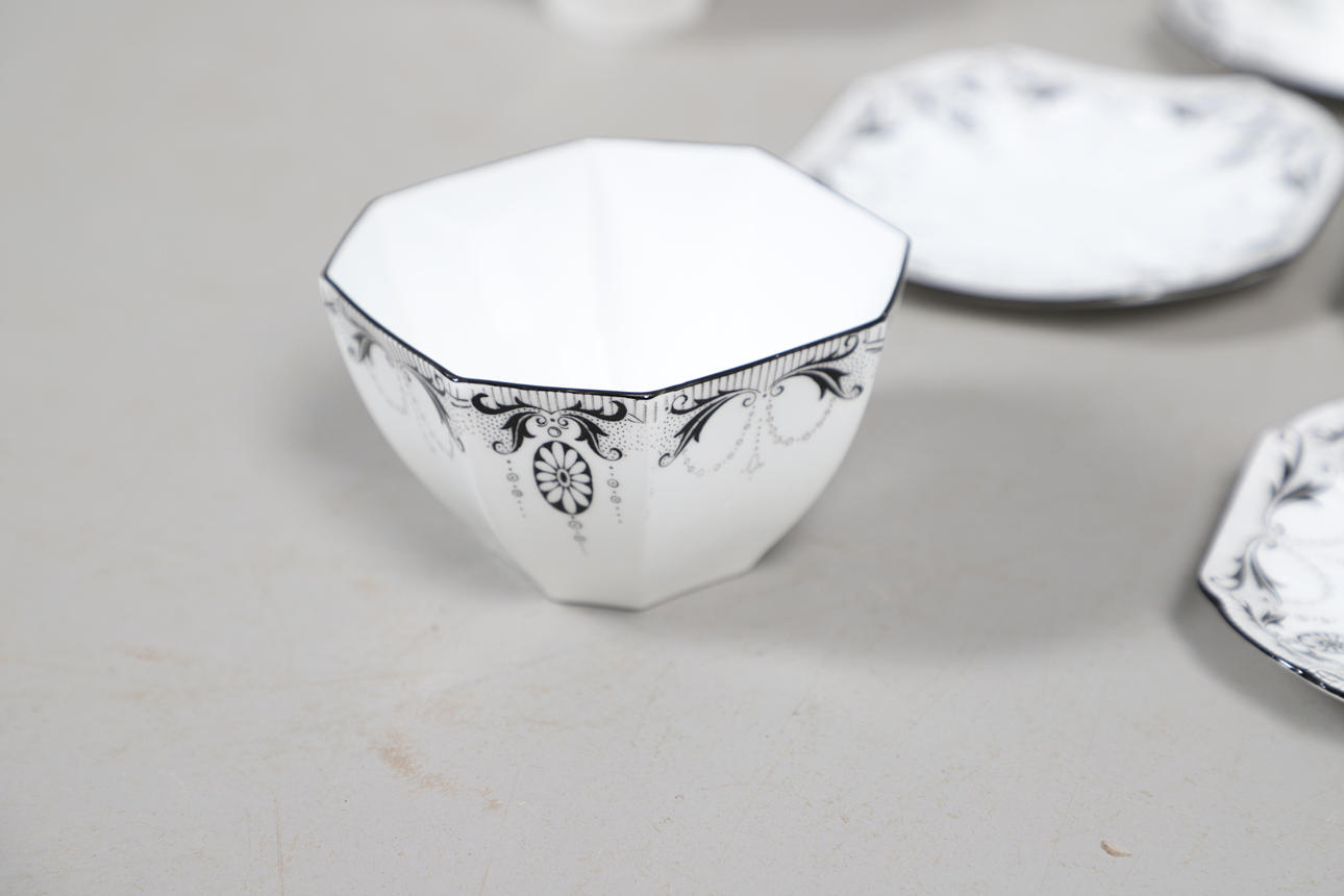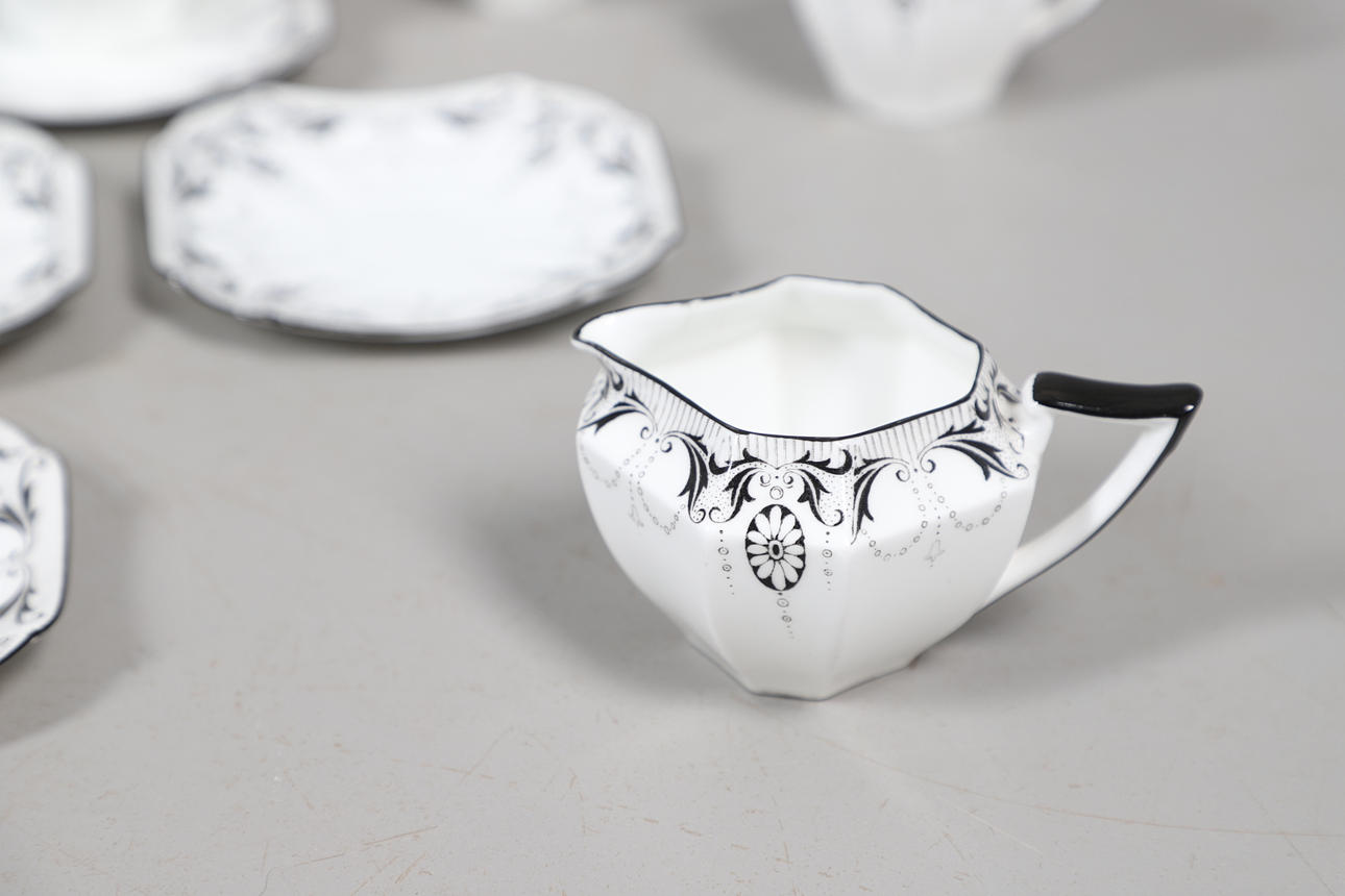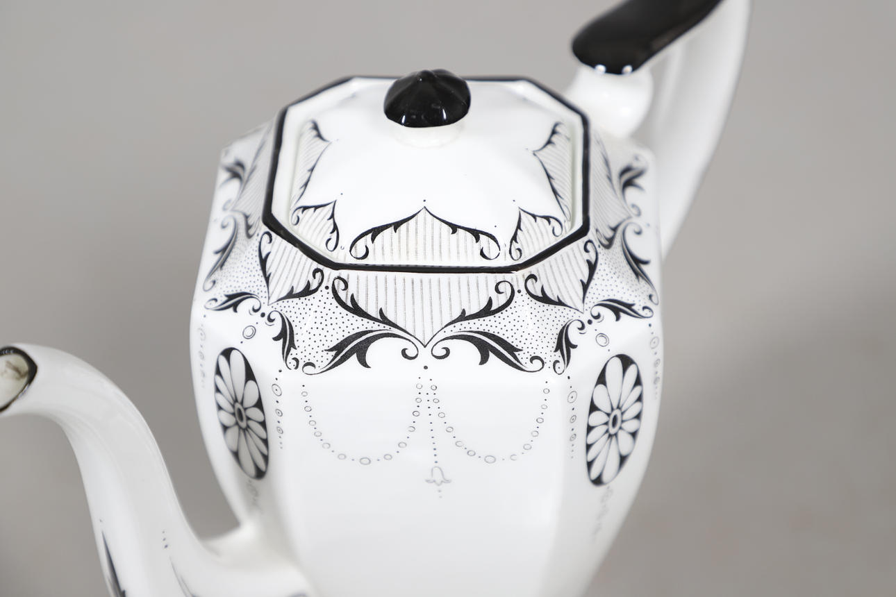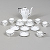 An art deco coffee set, pattern 11612 and in the Queen Anne shape. Comprising a coffee pot, milk jug and sugar bowl, 6 saucers and 6 cups. Coffee pot 19.5cms high.