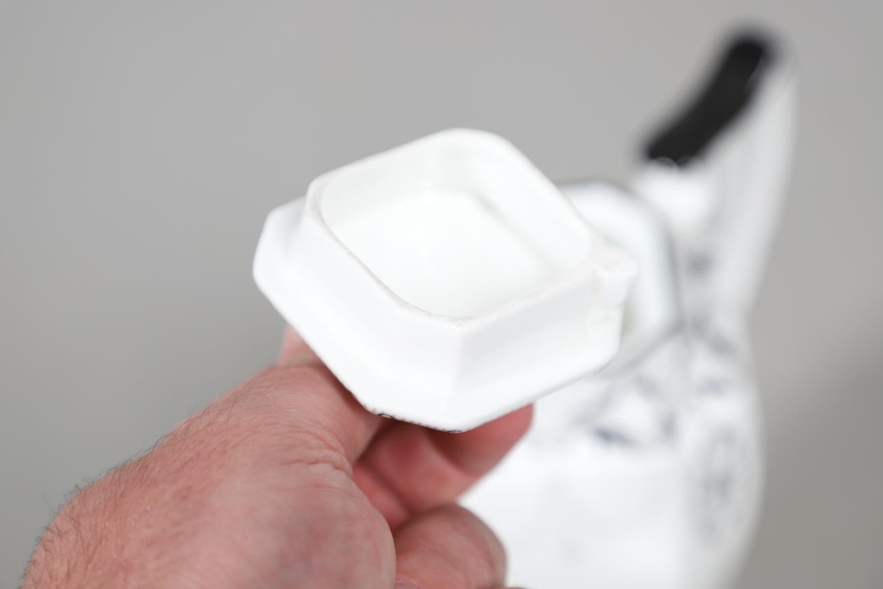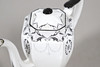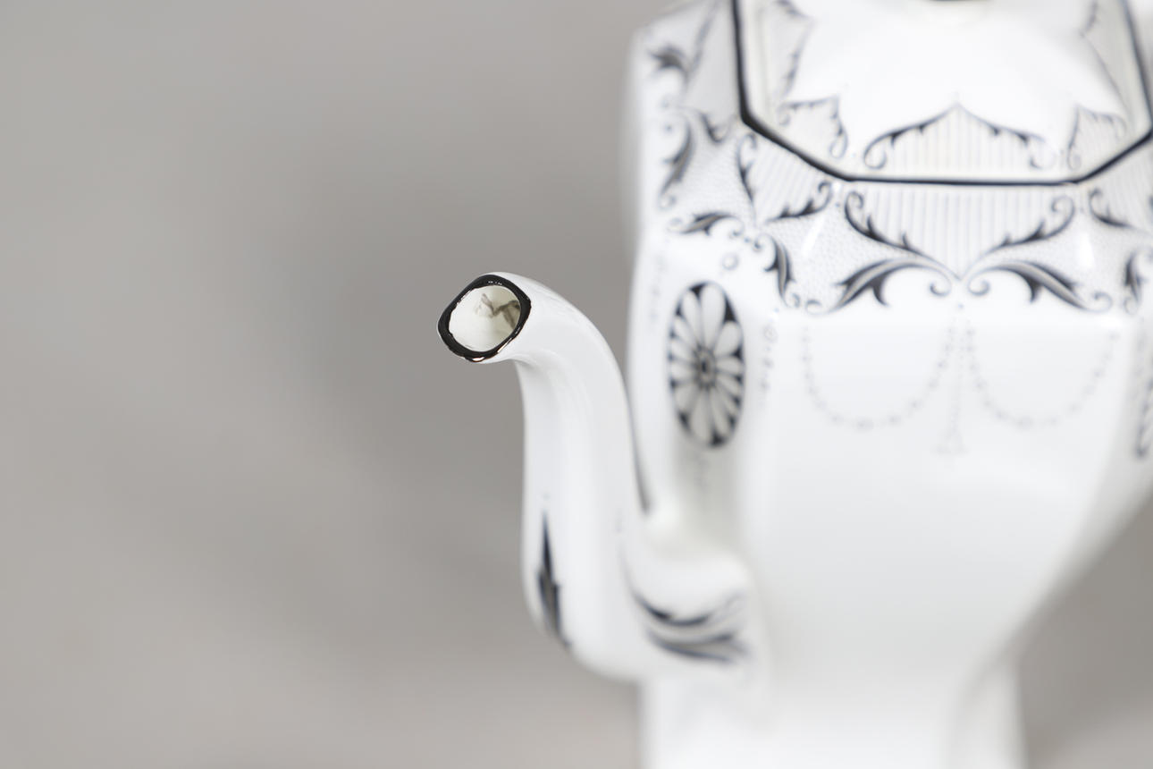 Coffee pot, small crack at the base of the spout, small chips around the base of the coffee pot.