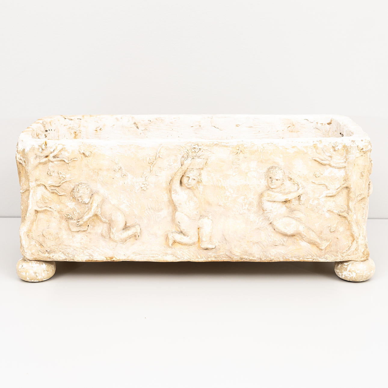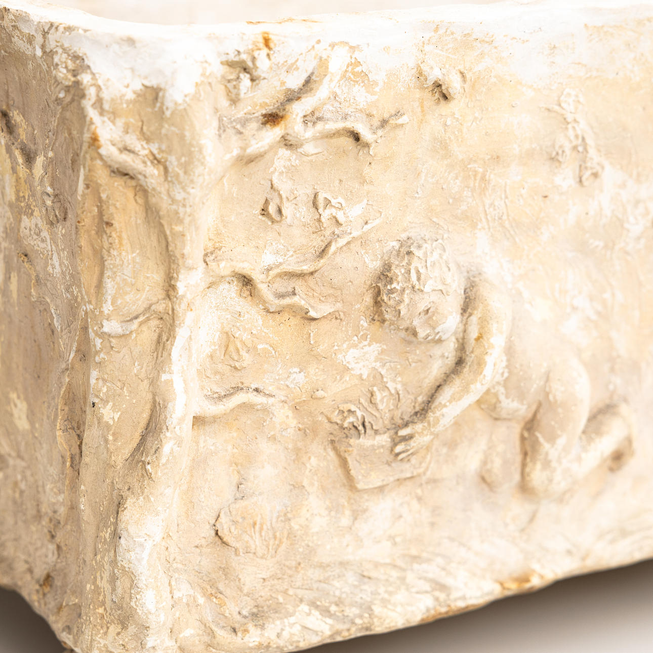 Relief figures in the form of working and sleeping putti. Length ca 54,5, depth 25 and height 23,5 cm.