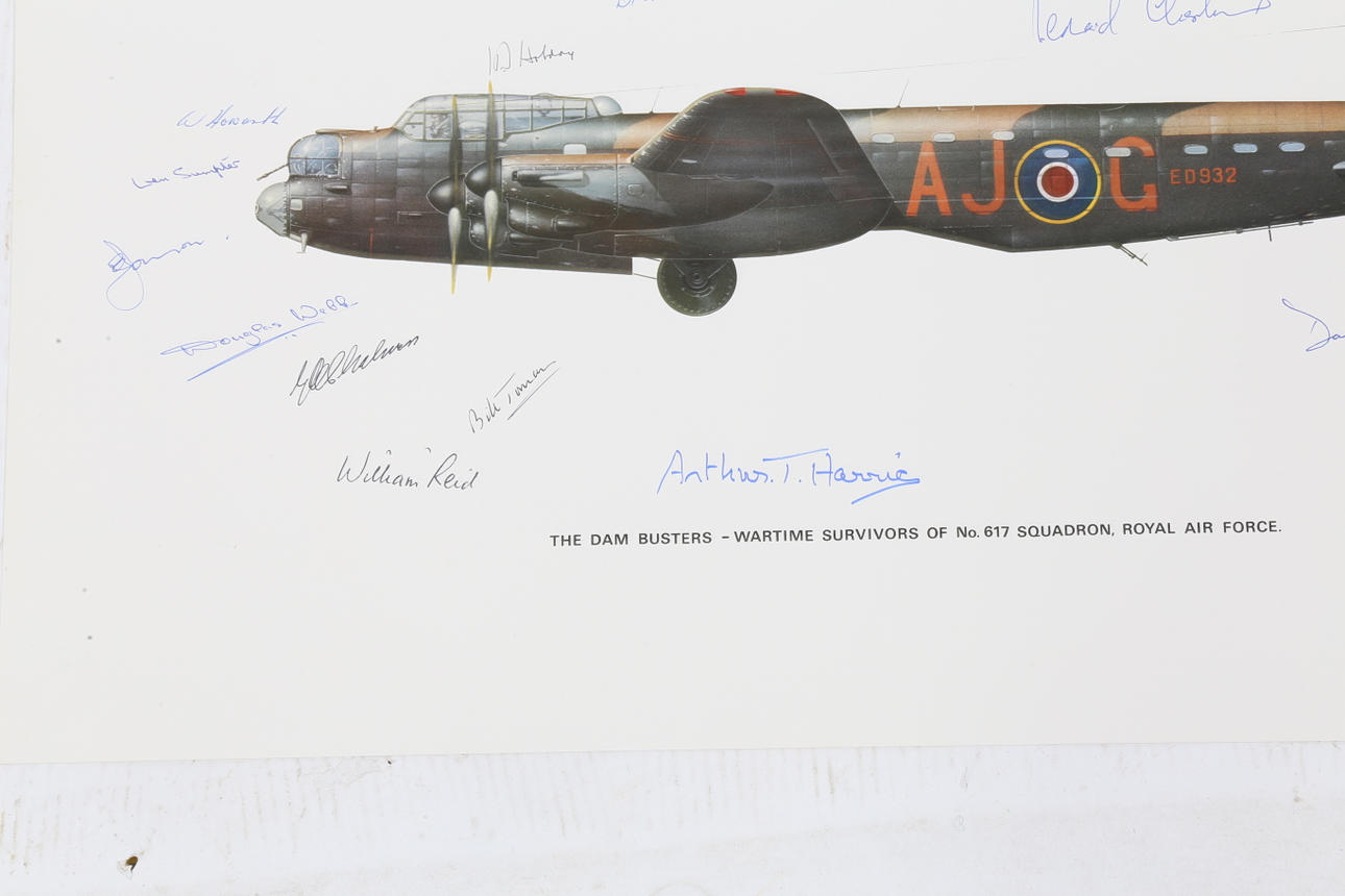 The Dam Busters - Wartime Survivors Of No 617 Squadron, Royal Air Force, signed by Arthur T Harris, Leonard Cheshire, Willy Tait, William Reid, Douglas Webb, Len Sumpter, 56cm by 38cm unframed.