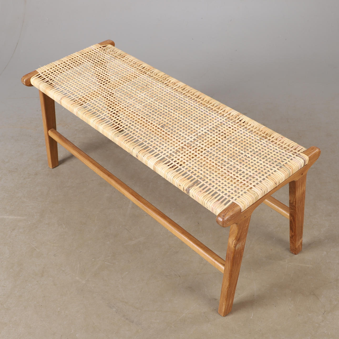 3764613. A contemporary teak and rattan bench.