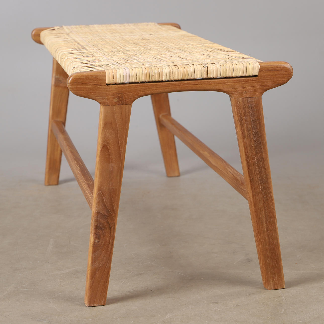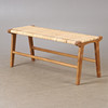 A contemporary teak and rattan bench.
