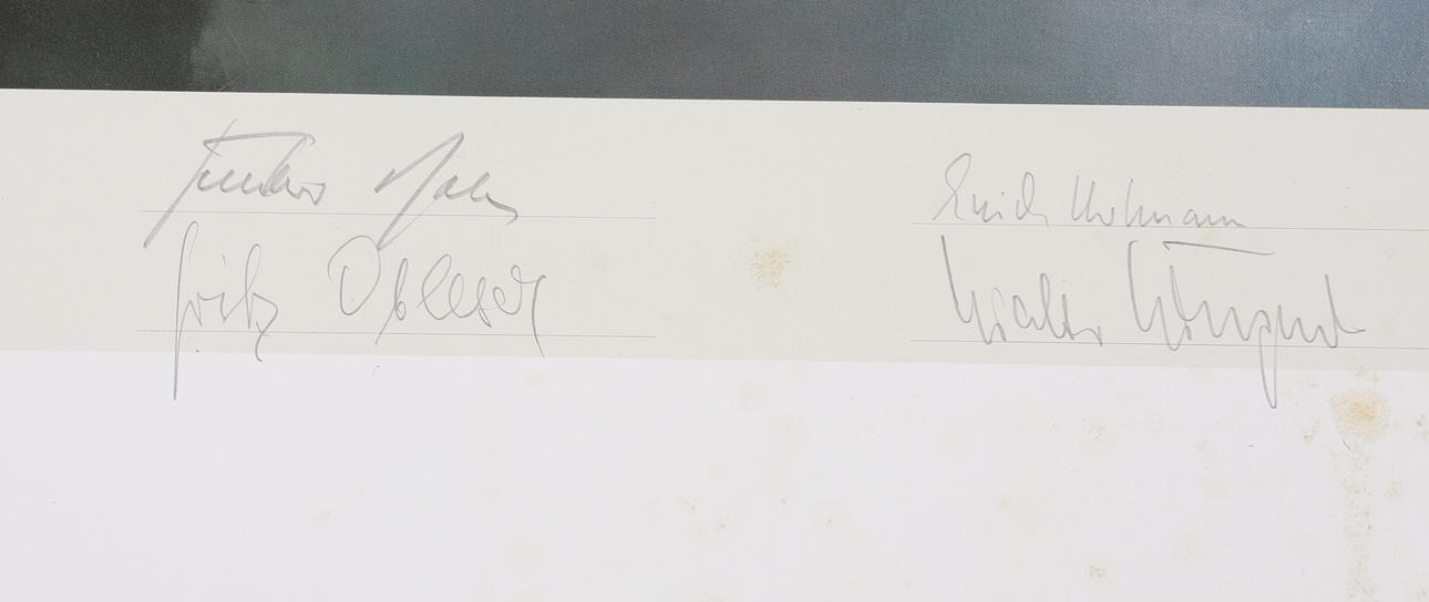 numbered 41/1000, signed by geman flying aces, and having pencil sketch of a Messerschmitt Bf 109 to the border, 83cm by 63cm unframed.