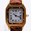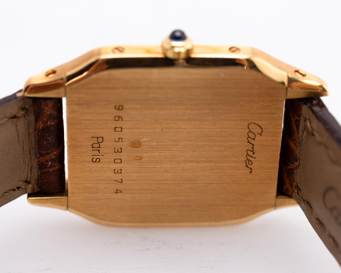 Cartier “Santos Dumont Ultra Thin” women's wristwatch. 18 kt case. Yellow gold, white dial with minutes and hour hand, crown with sapphire cabochon, screwed caseback, numbered, original leather bracelet with pin buckle. Manual winding, housing dimensions approx. 23mm x 32mm The clock was running at the time of the review, Auctionet.com does not guarantee functionality.