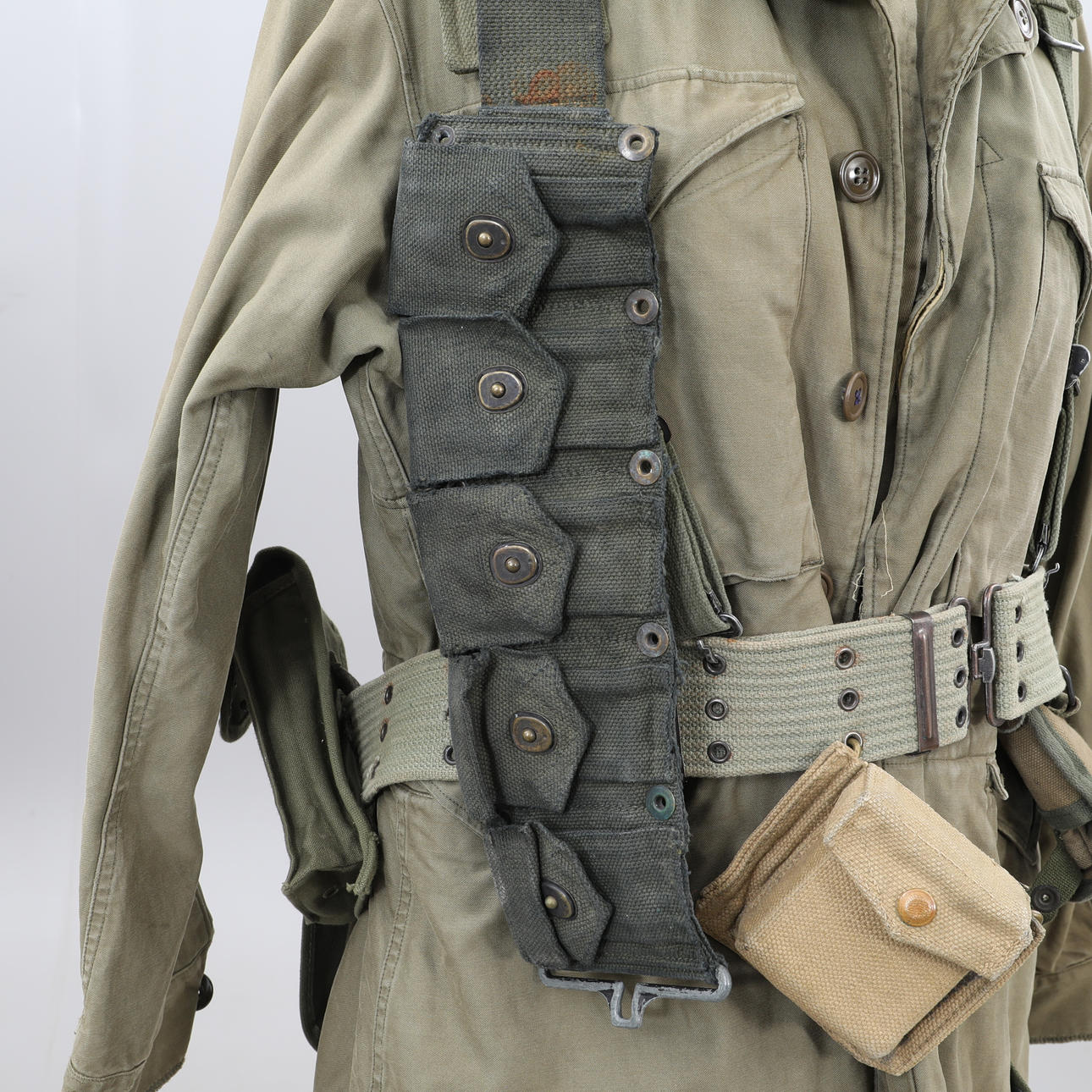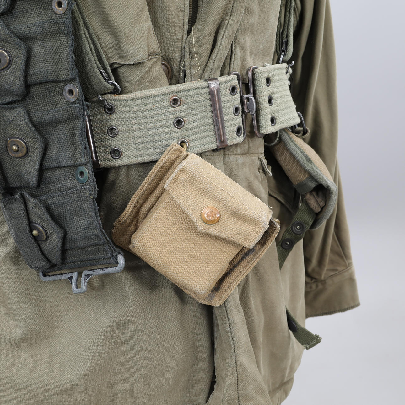 An m43 field jacket from the USA with a so-called “gun belt” with pockets for magazines, ammunition, etc.