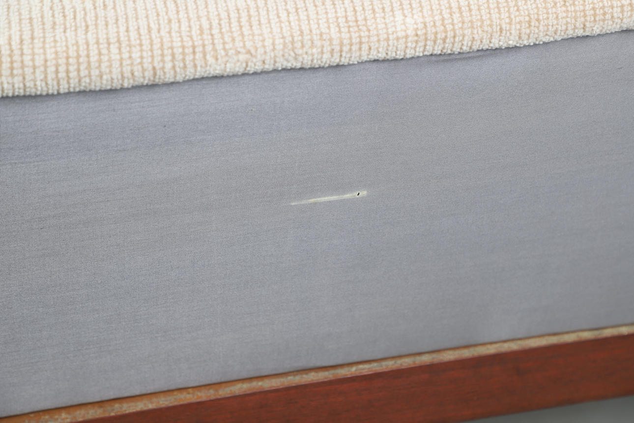 Some scuffs and marks around the legs, a few marks to the back of the upholstery.