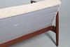 A large teak sofa bed with tapering arms and legs, with a mechanism which moves to convert from a sofa to a bed. 199cms across, 73cms high.