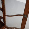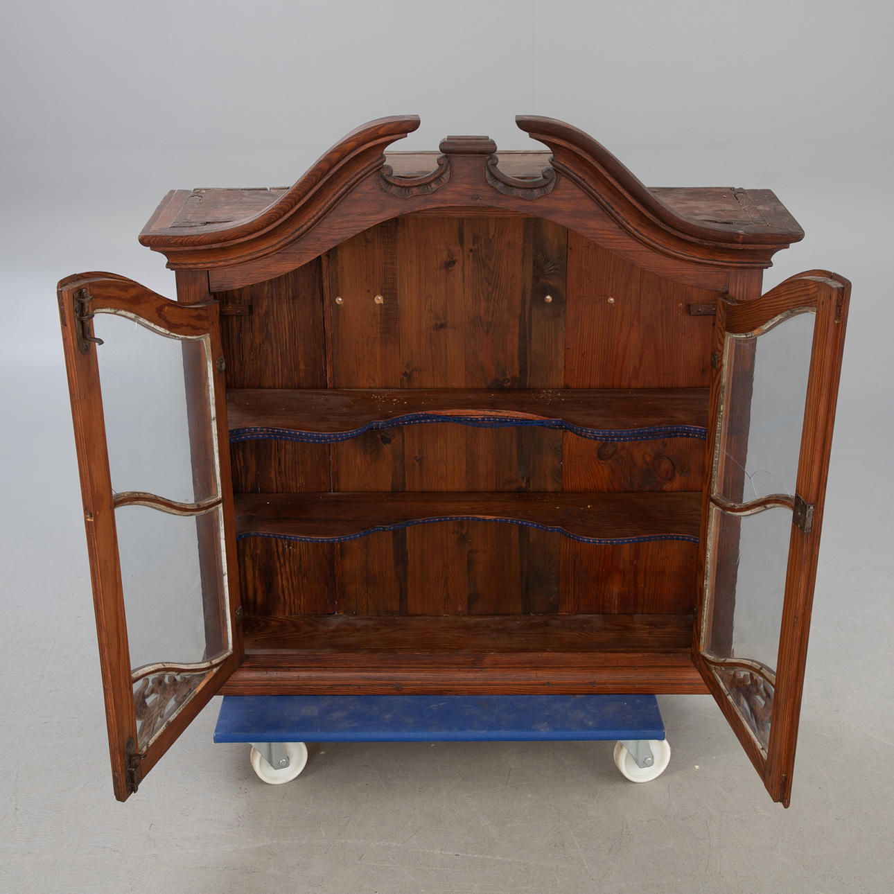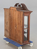 Softwood, dark stained. Three-sided glazed display cabinet with vertical and curved struts. Brought up pediment.