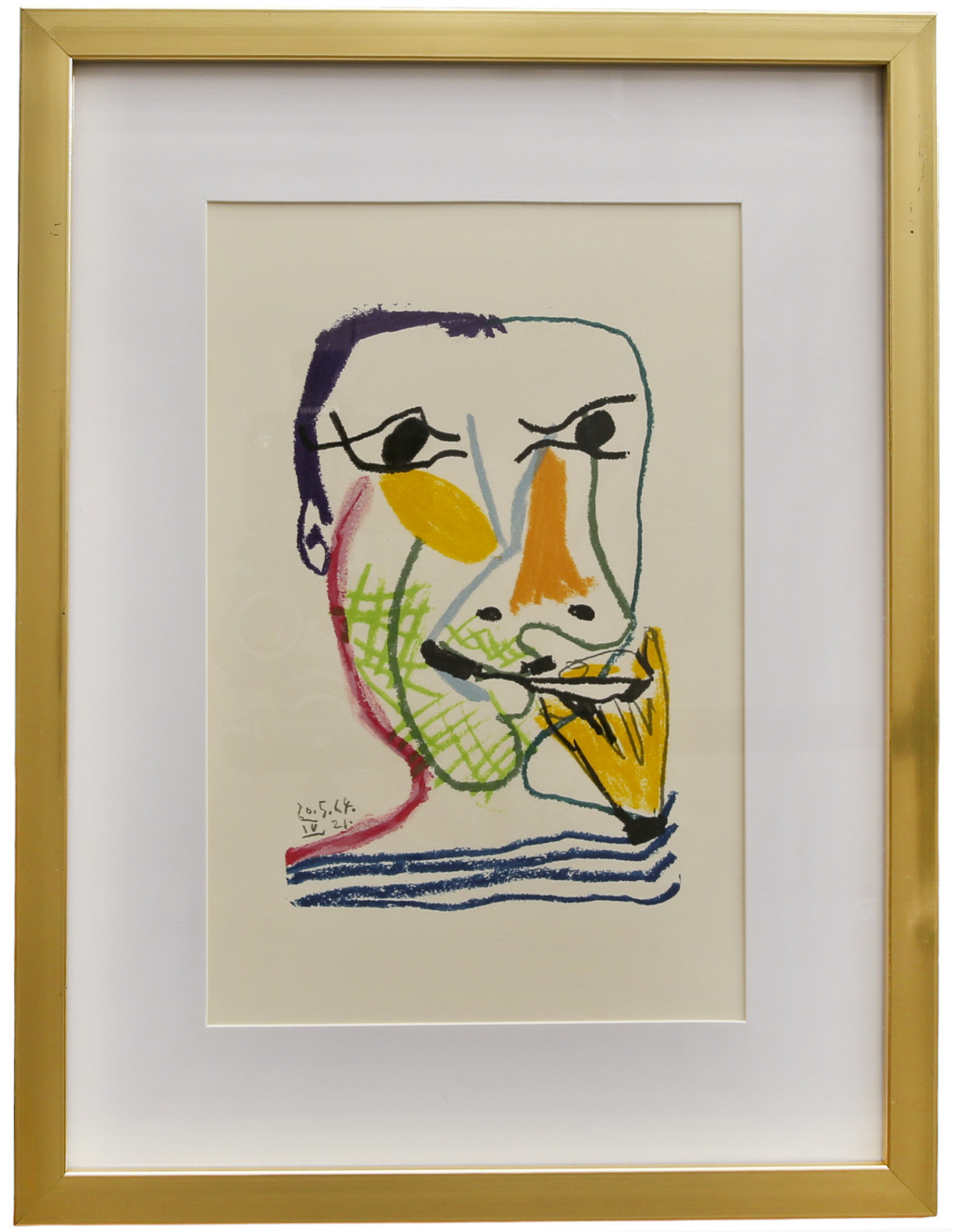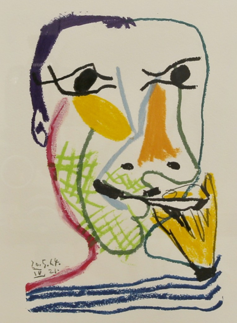 3773055. PABLO PICASSO. After, colour lithograph, smoking man, from the folder “LE GOUT DU BONHEUR” Schünemann, no 403/666, year 1970.