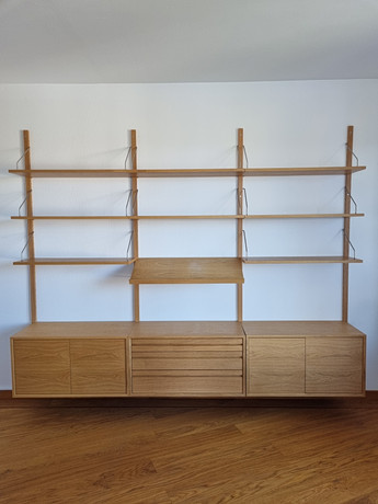 Condition of use. Minor marks and scratches appear. Two shelf brackets are missing. Attaches image of what the brackets look like.