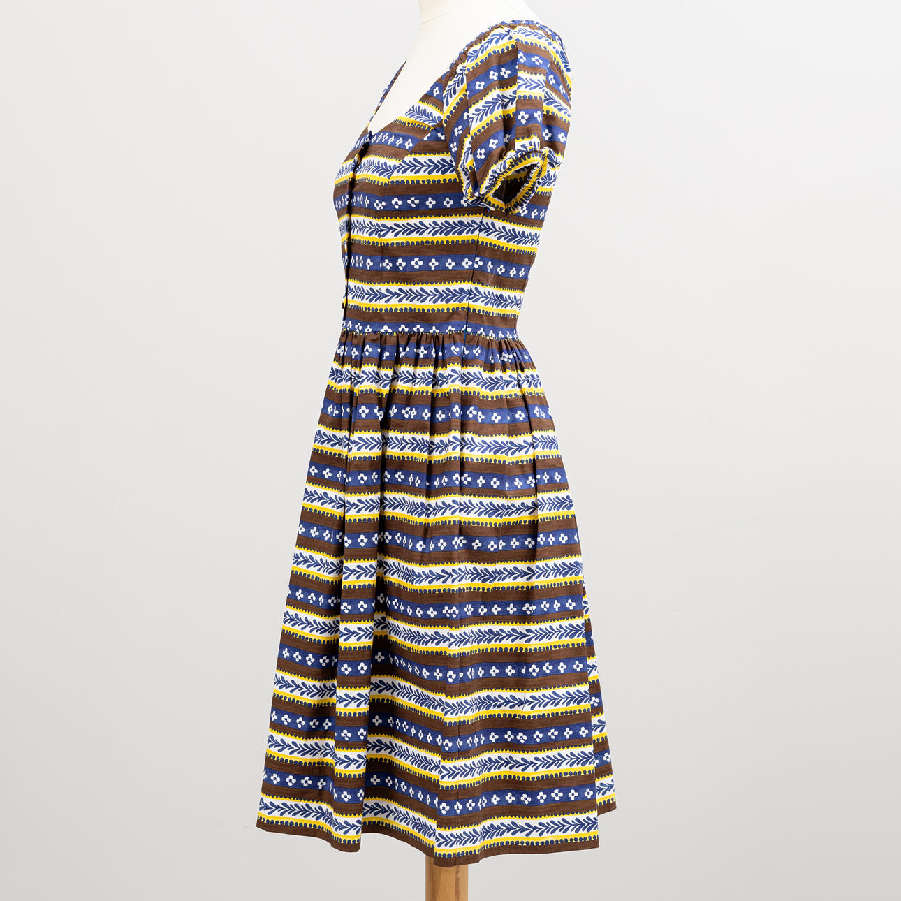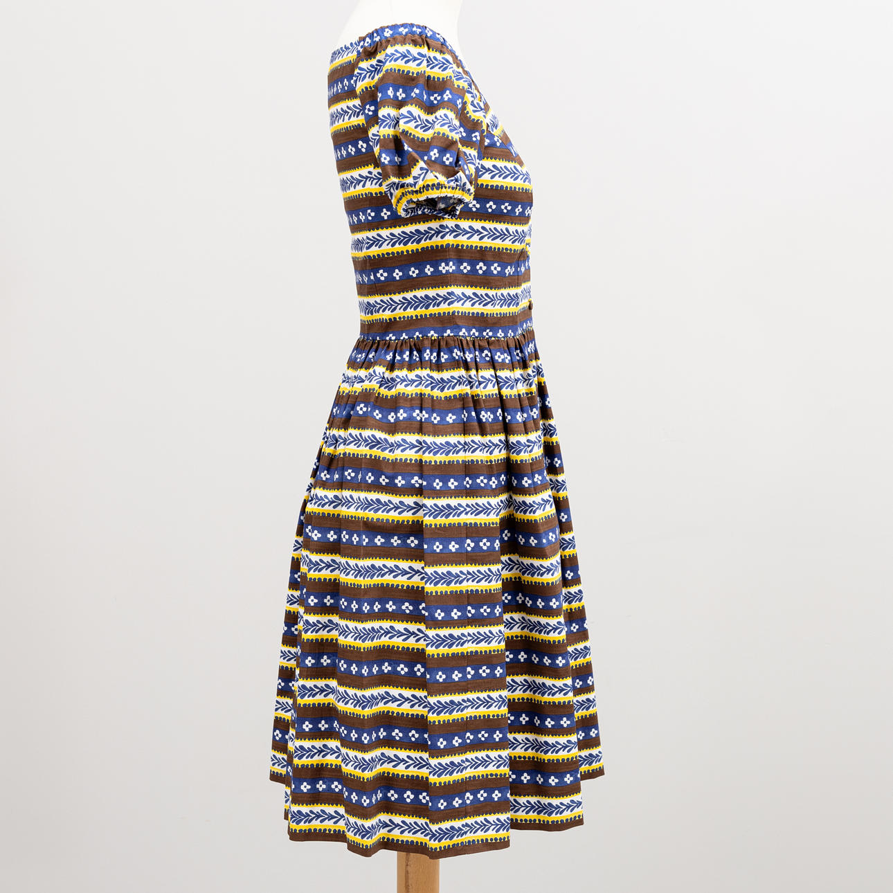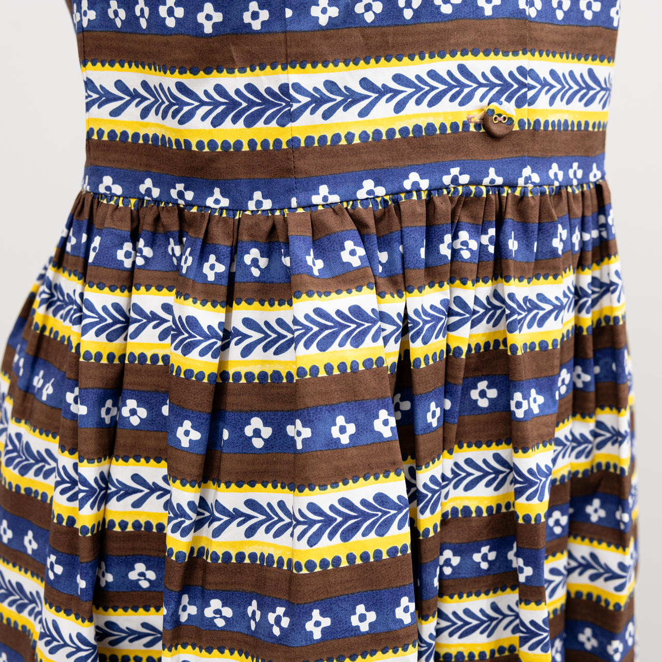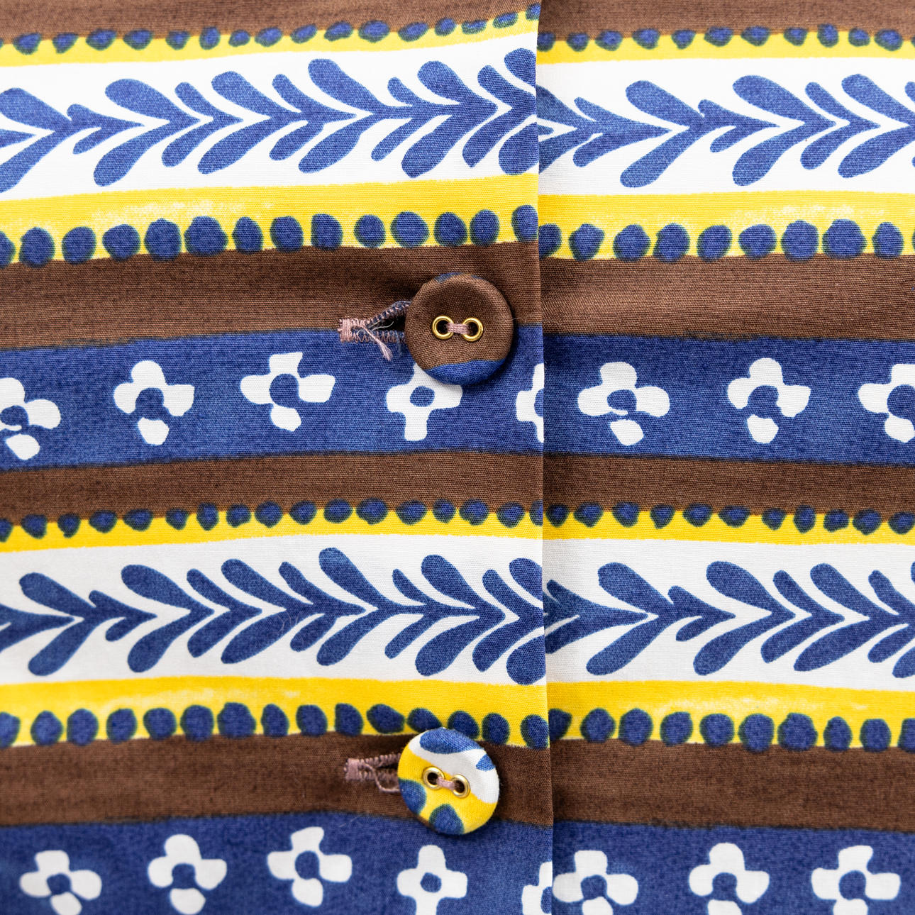 Pattern in yellow, brown and blue. Size 38S.