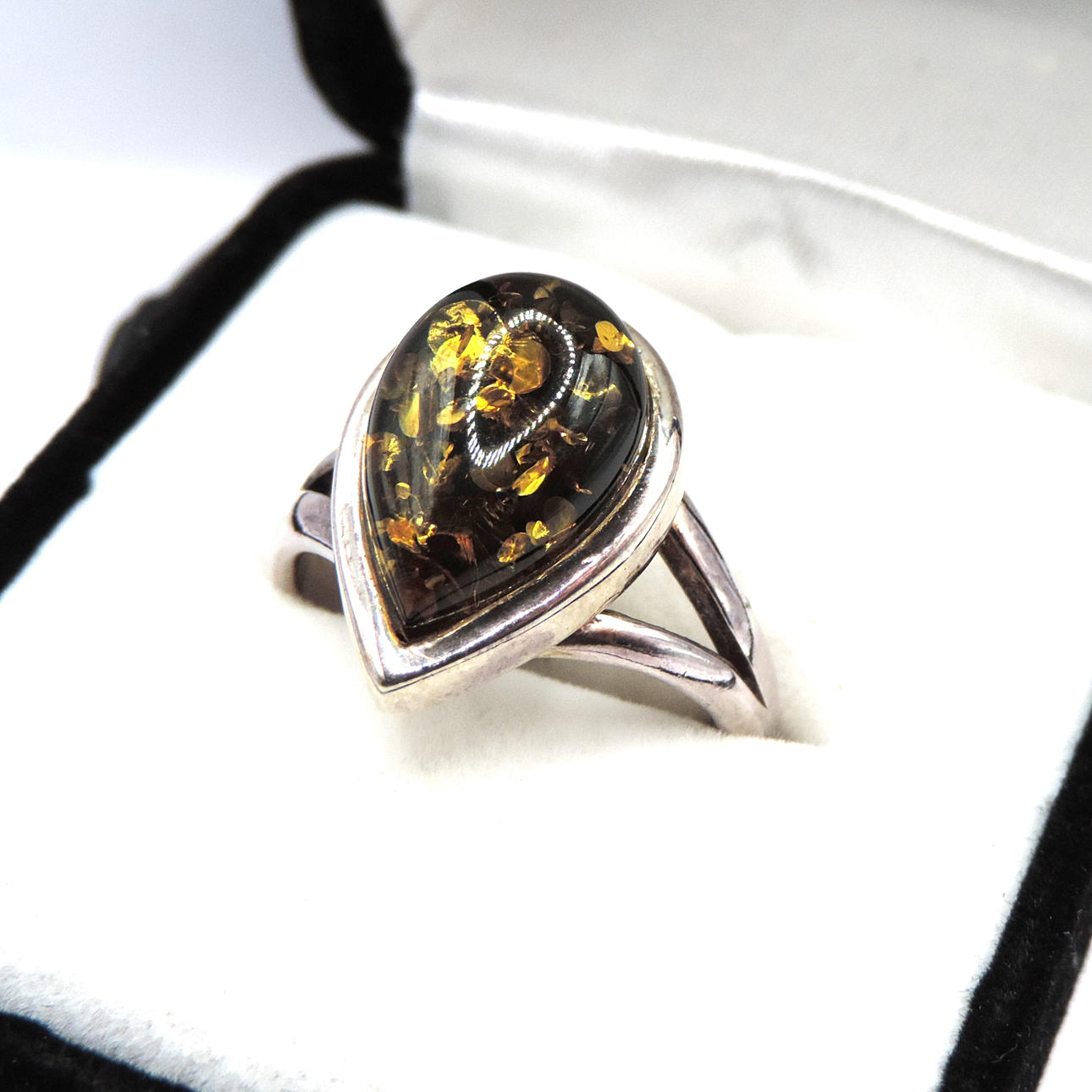 Sterling Silver Ring  set with a cabochon pear shape Amber gemstone. Ring size Q1/2.