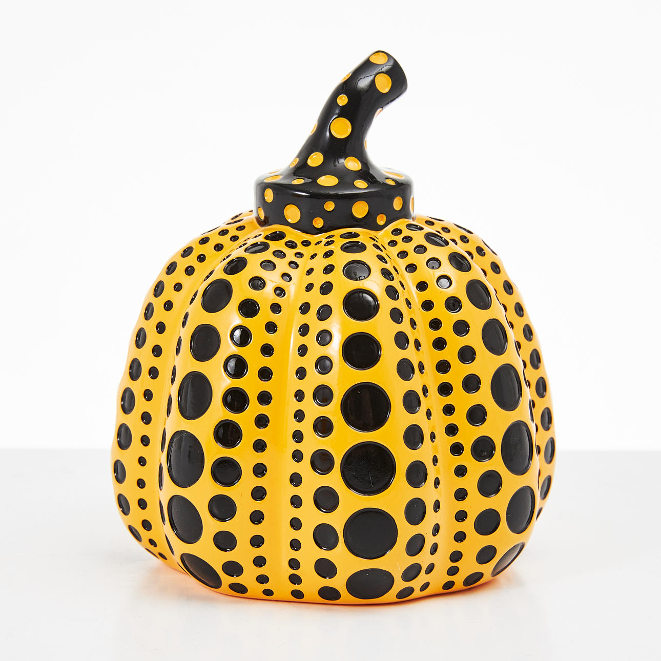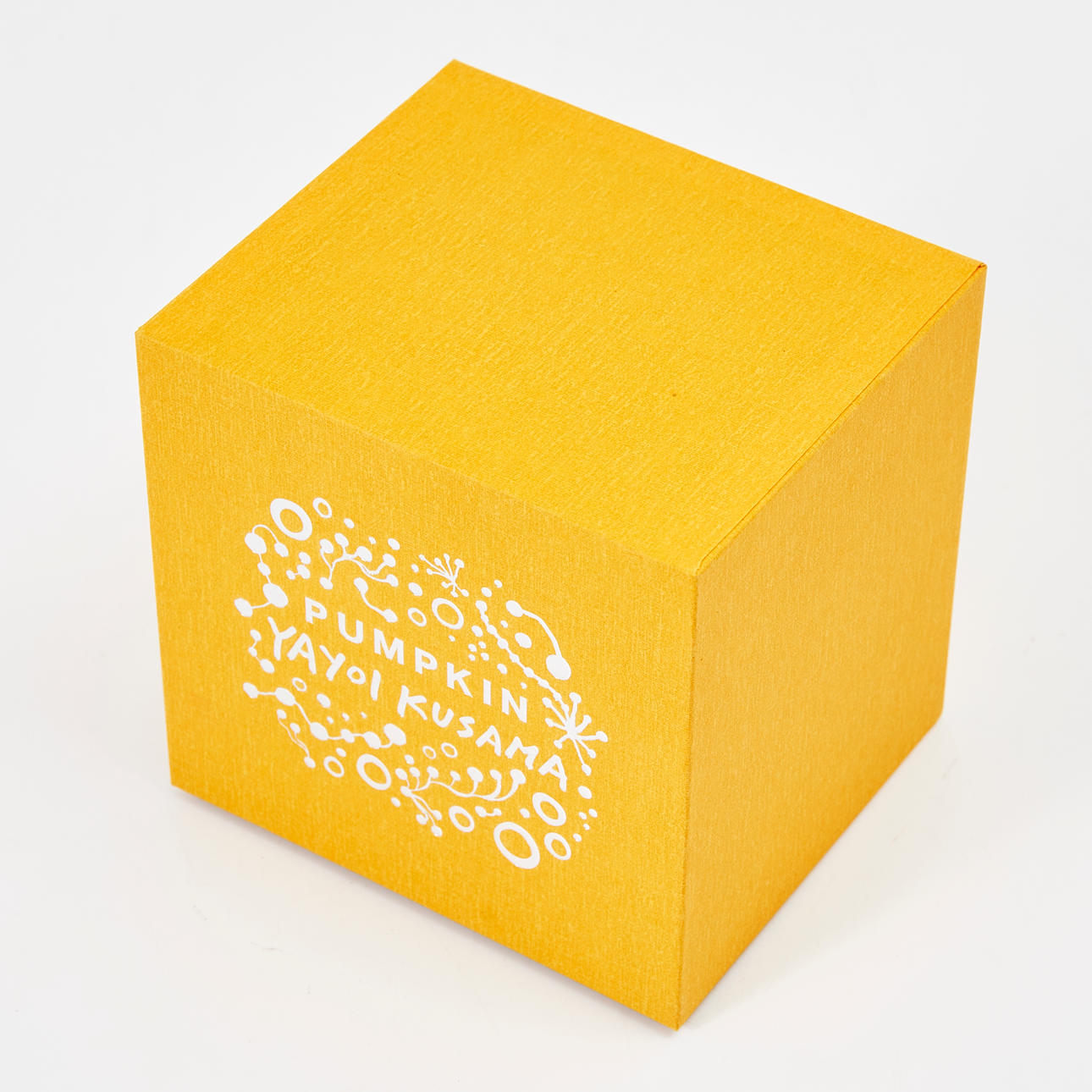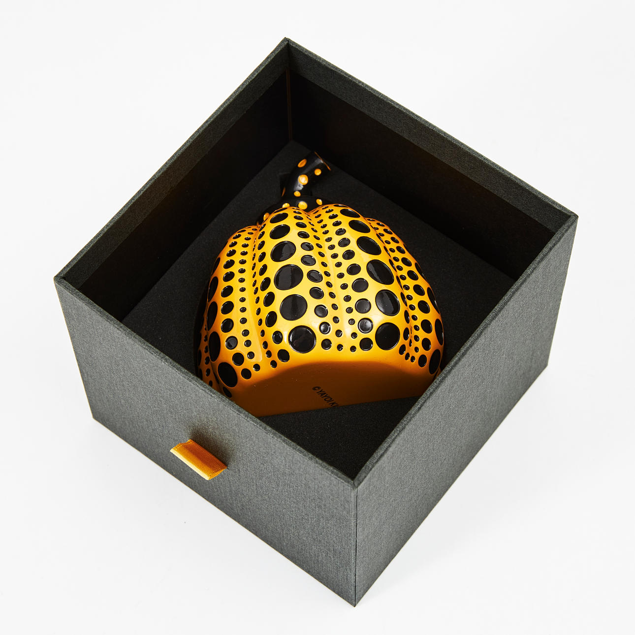 In original packaging, marked at the bottom © Yayoi Kusama, the height of the pumpkin approx. 10 cm, the dimensions of the carton 11, 12.5 x 12.5 cm.