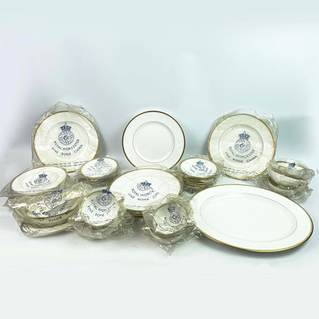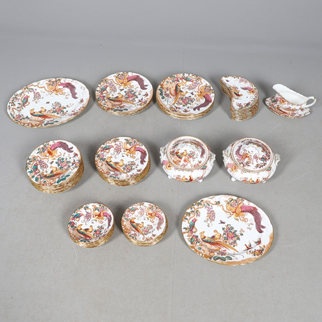 A part dinner service painted with flowers on a cream ground, comprising 6 dinner plates (25cms diameter), 2 lidded tureens, 6 smaller dinner plates (22.5cms dia), 6 side plates (20cms dia), two oval dishes and a gravy boat.