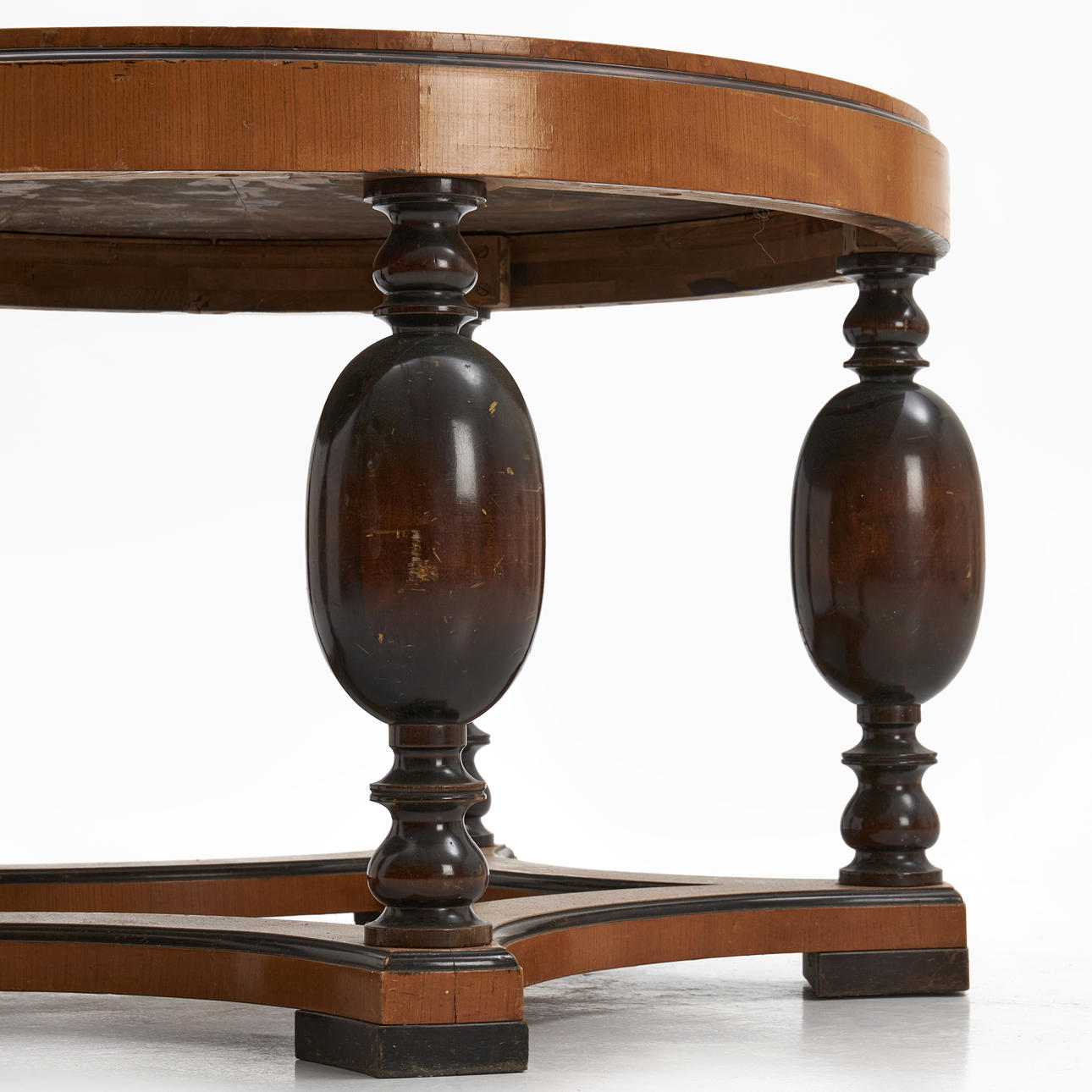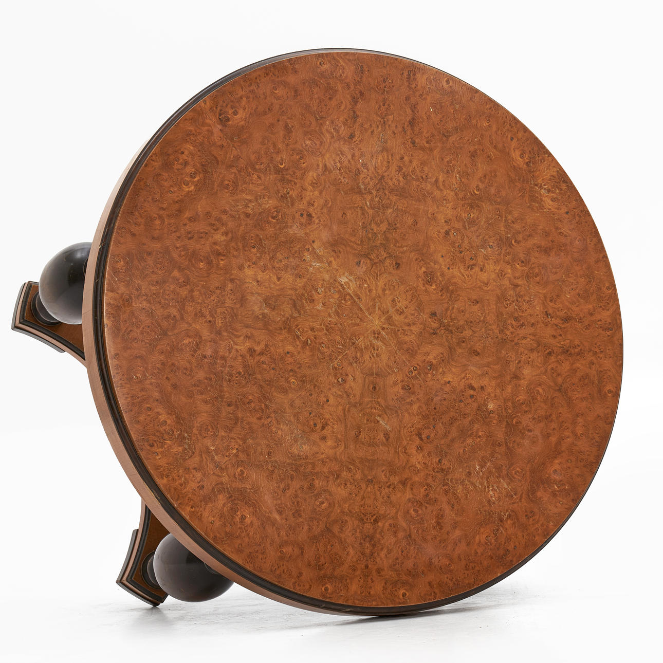 3787174. A 1930's coffee table, birch root top, baluster-shaped legs in boned birch.