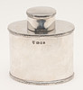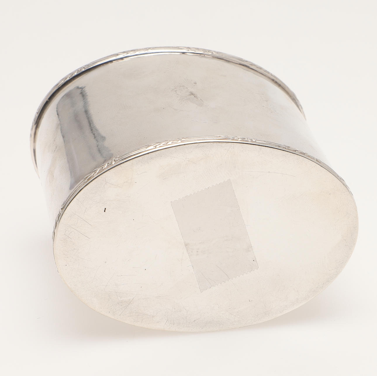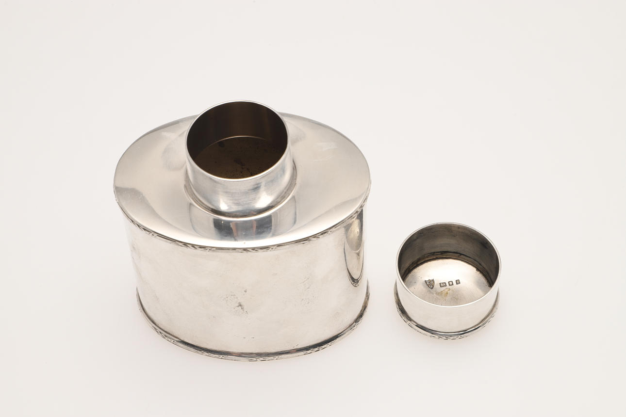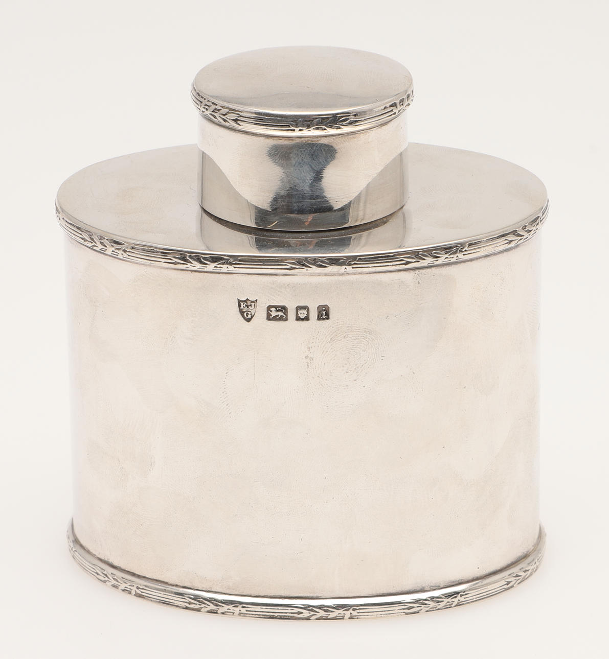 of oval form, with ribbon & reed borders and a pull-off cover, by Ellis & Co, London 1924; 3.75" (9.5cm) high; 8ozt.