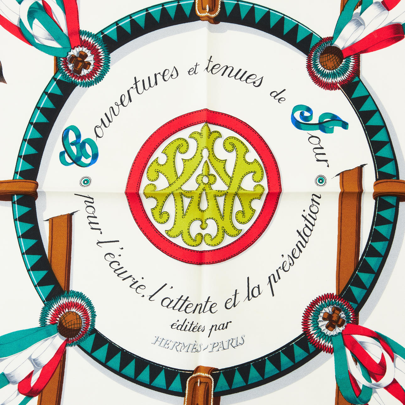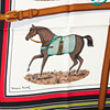 Foulard side. Design by Jacques Eudel in 1974. Motif of horses with quilts, harnesses and bows against cream-colored bottom. Border in black, red and green. Signed and marked “HERMÈS-PARIS”. Approx. 90 x 90 cm.