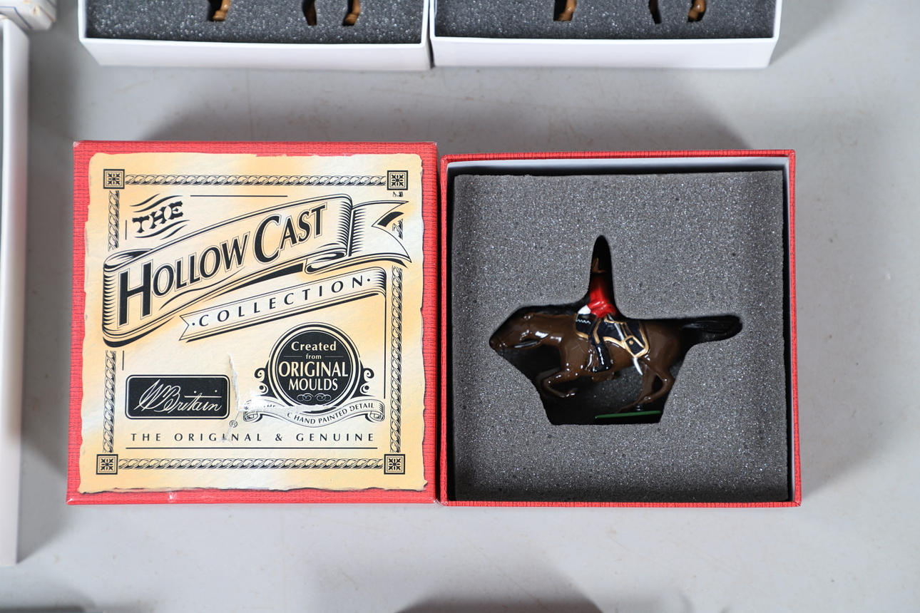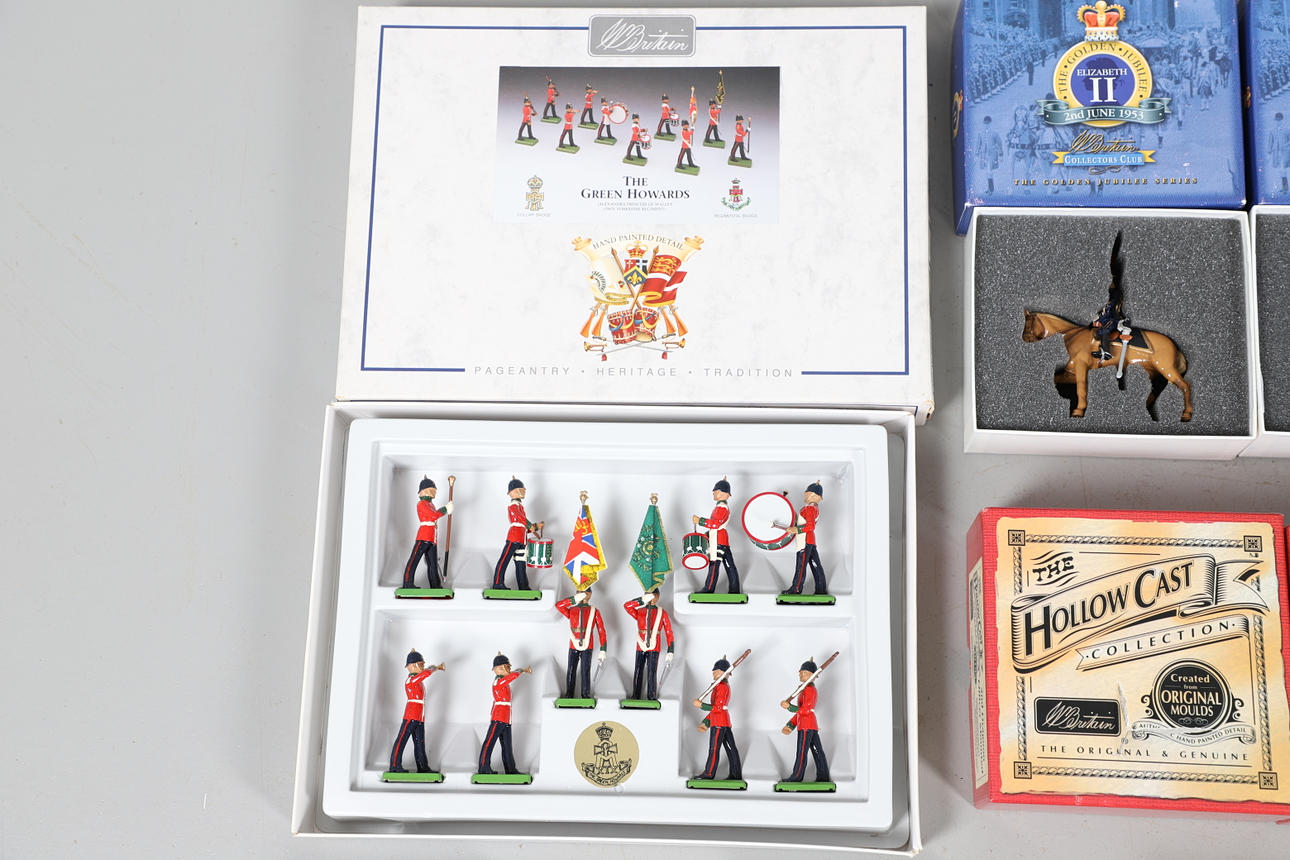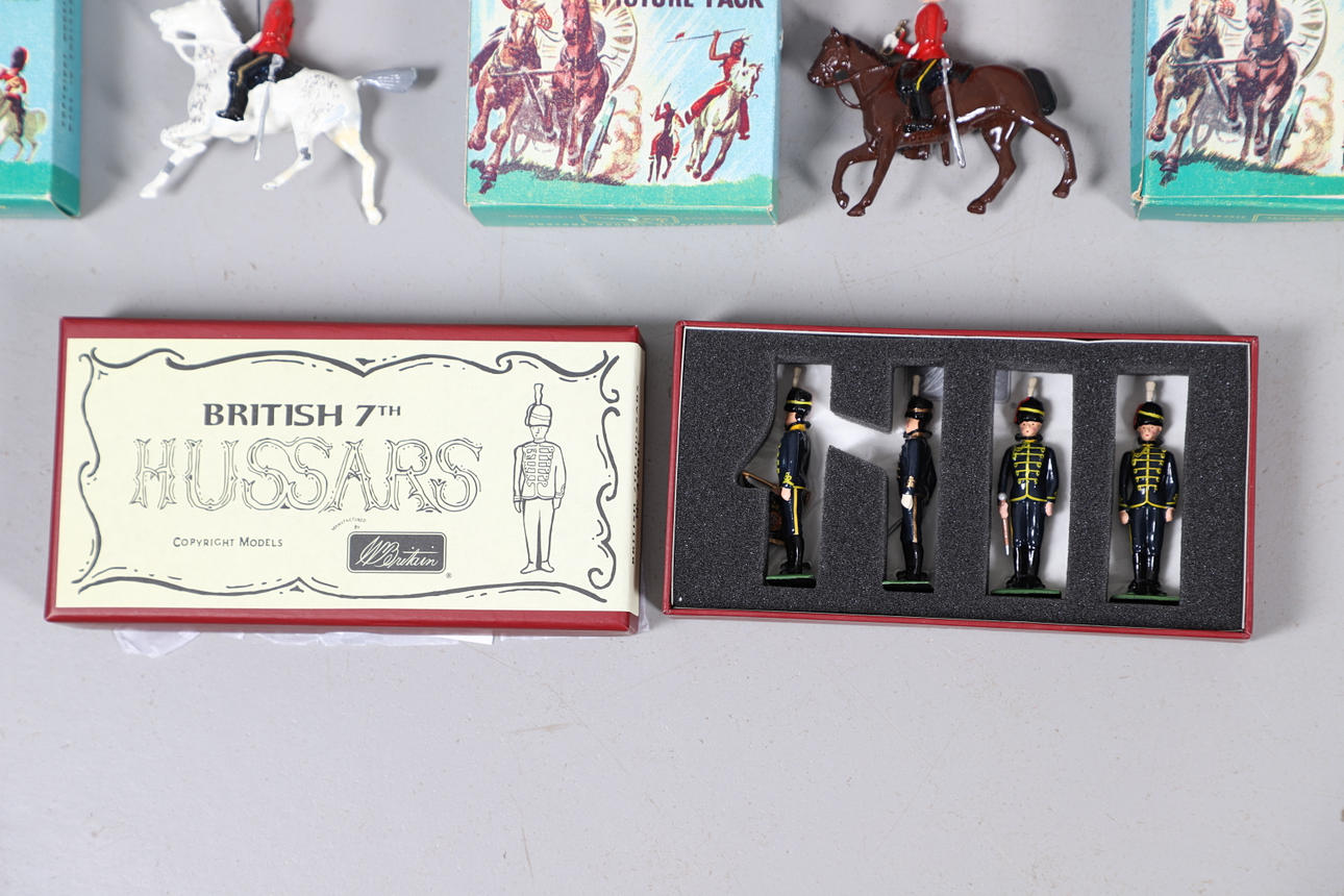 Various boxed items including 5800 Green Howards, 40277 4th Queen Own Hussars Officer (x2), 40199 2nd Dragoon Officer (top of box with damage), three Britains Picture Packs, and 49011 British 7th Hussars.