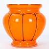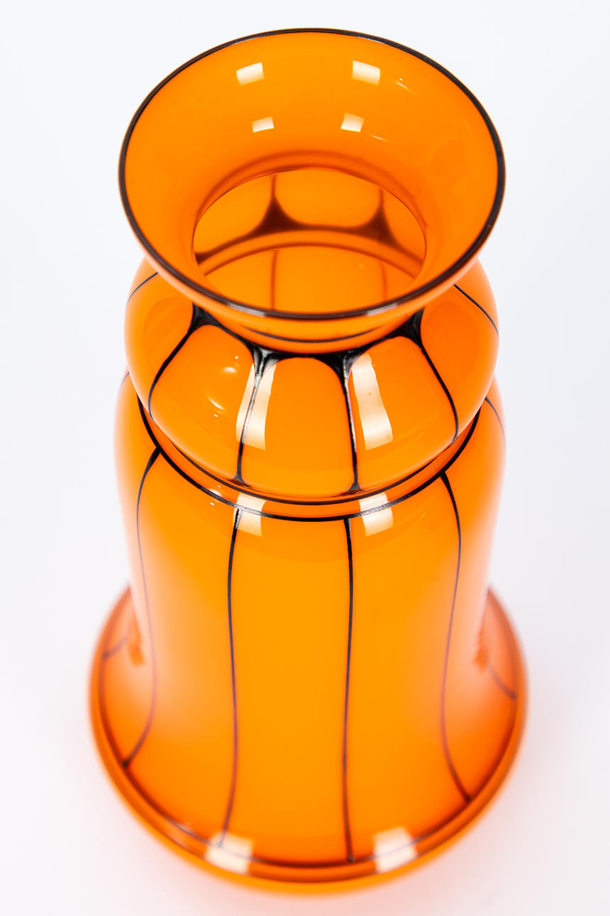Lötz widow, Klostermühle, vase made of colorless glass, orange-red underlay. At a standstill, the varying, biconically rising wall with a bulging balustrated intermediate element and raised lip edge. Placed black muzzle and vertical threads, ca. H 22 x 8.5 cm.