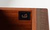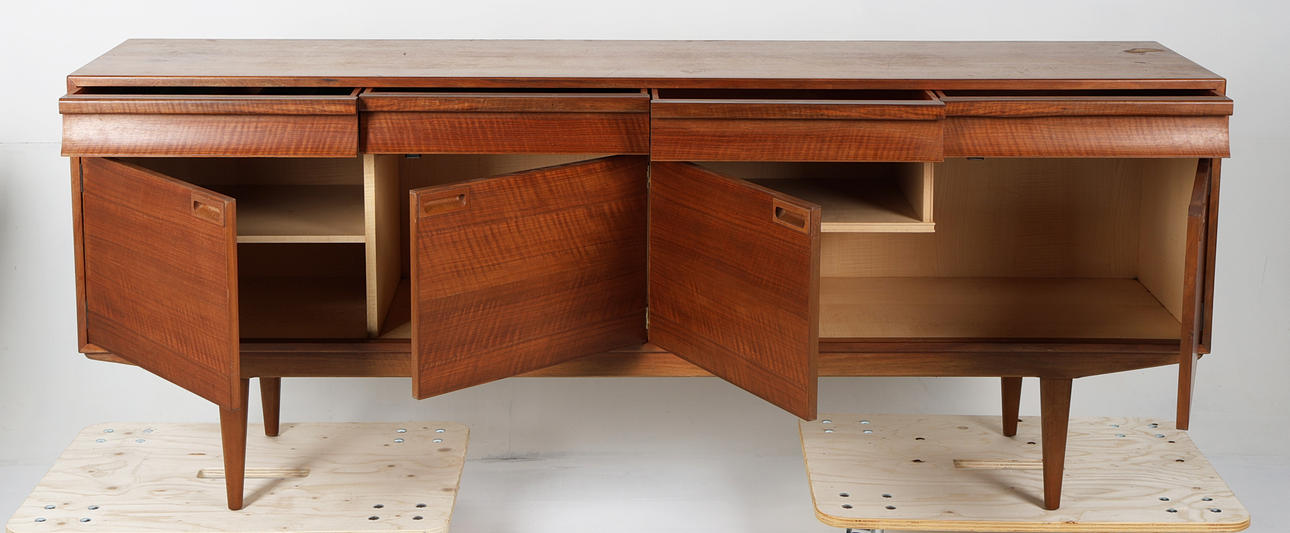 The teak sideboard with four drawers and cupboard doors, raised on square tapering legs, label to a drawer interior, approx. 82cm height, 206cm width, 47cm depth.
