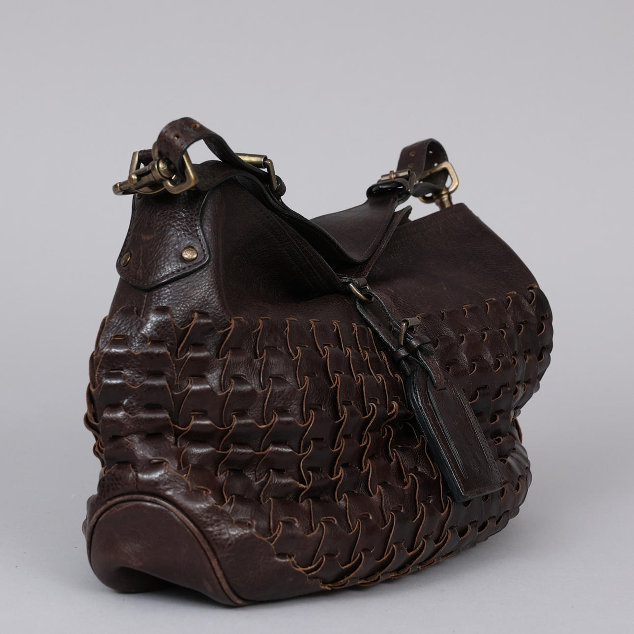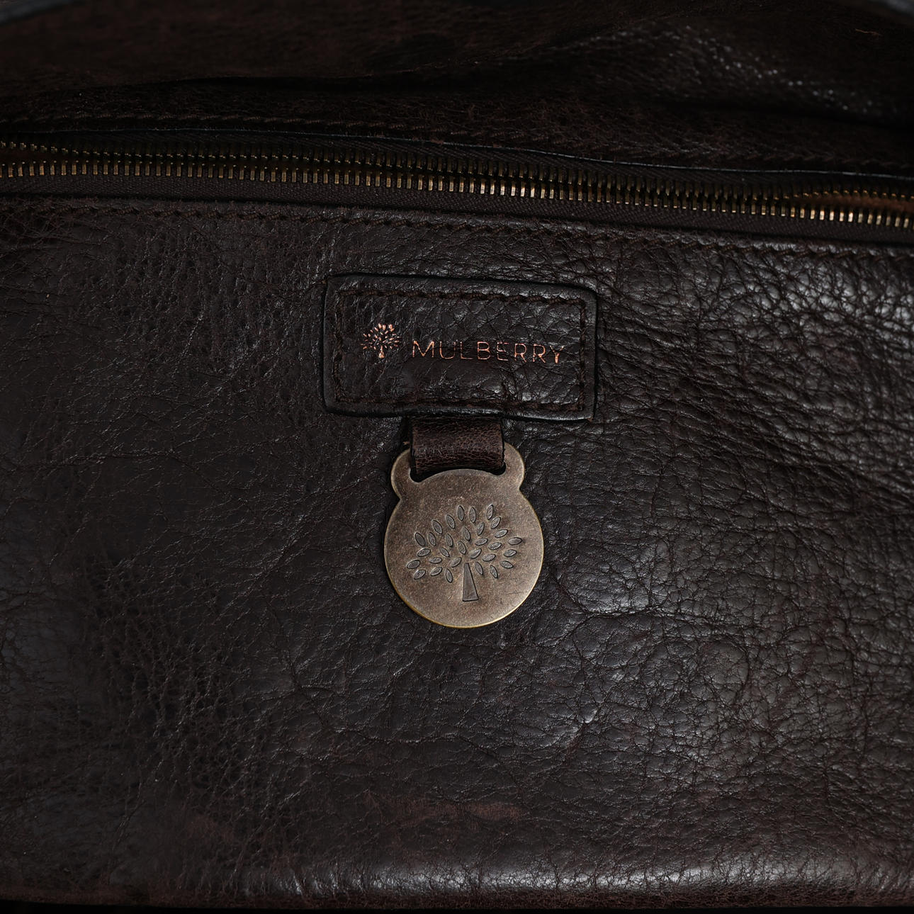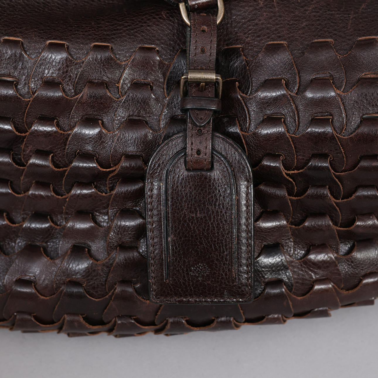 Brown braided leather with brass details. Removable and adjustable shoulder strap. Inside pocket. Numbered brass plaque. Branded Mulberry. Dimensions 40x28x10 cm. Dustbag included.