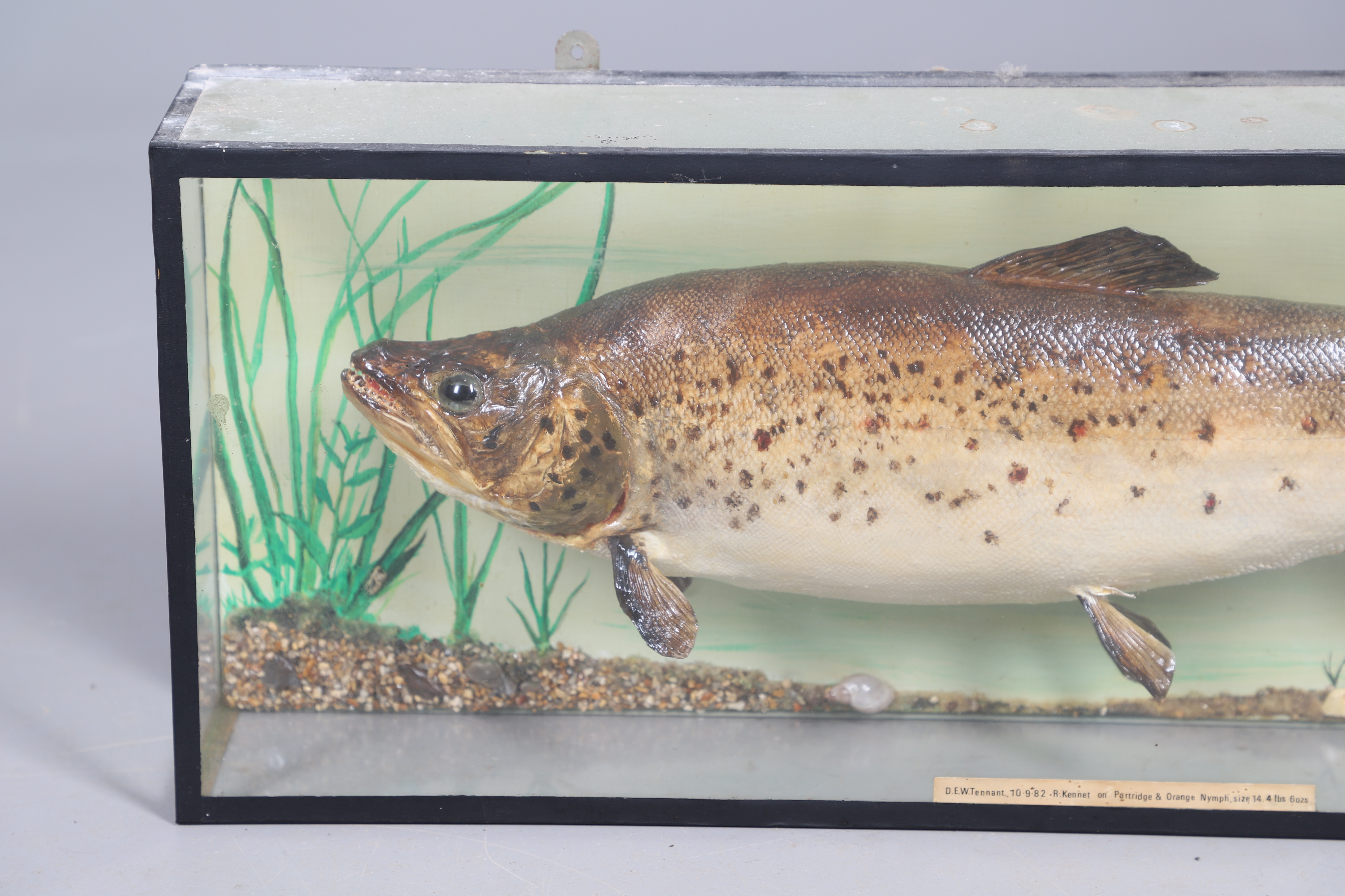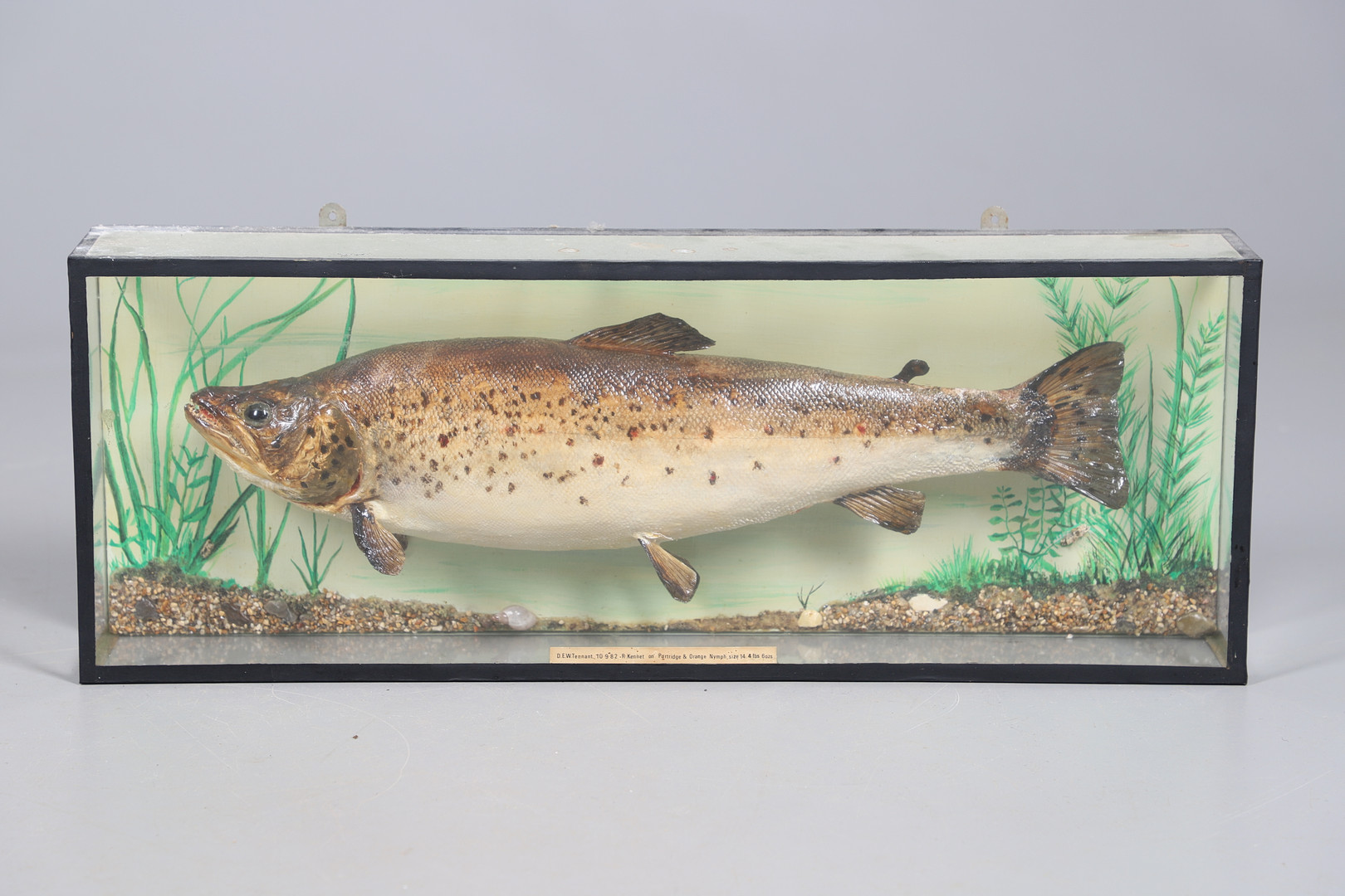 3816294. A STUFFED FISH IN DISPLAY CASE.