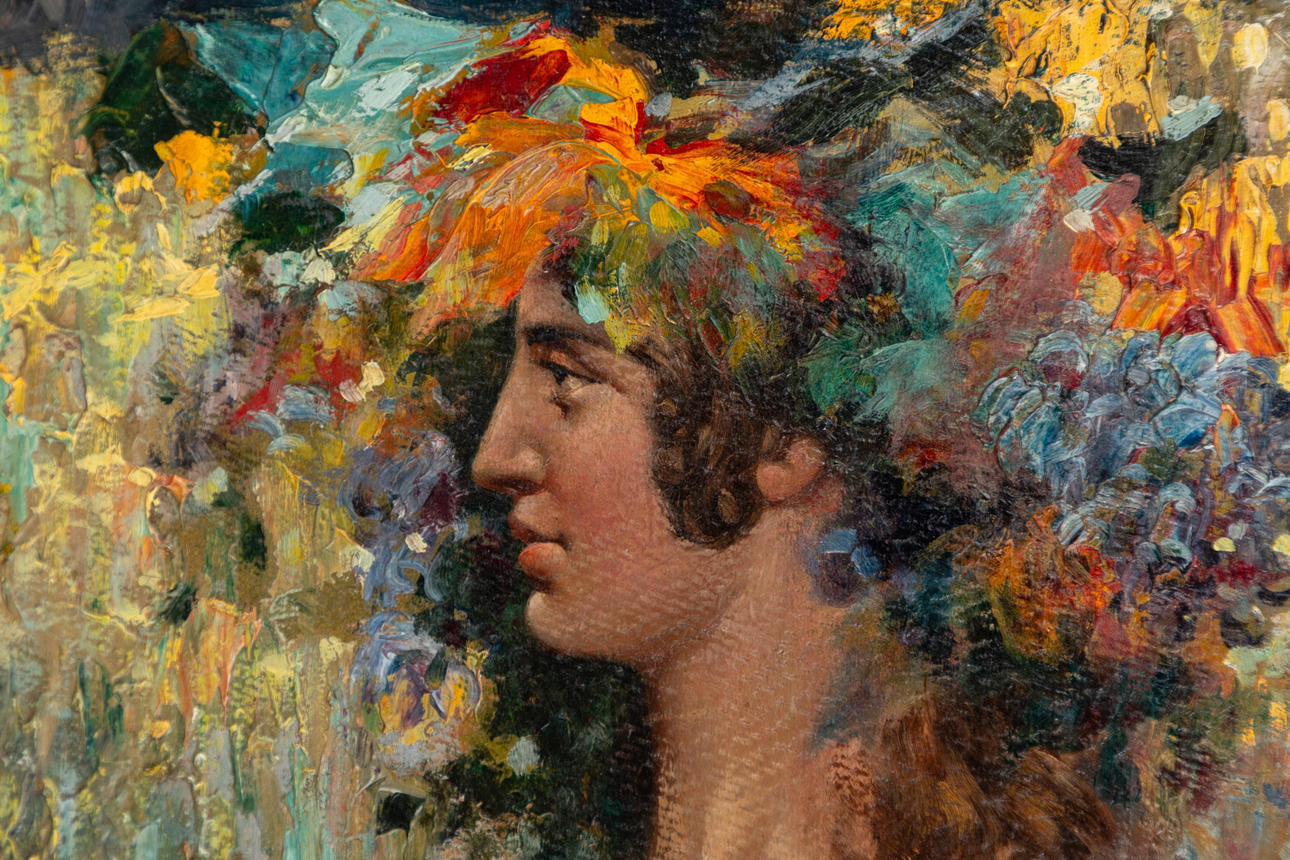 Attributed to Alejandro de Riquer Inglada (1856-1920), (Alexandre de Riquer), nymph, oil on cardboard, c. 20 x 32.5 cm, with frame approx. 40 x 52.5 cm.