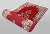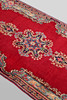 Main field with red base color and five medallions and corner ornaments in polychrome colors. Main border with dark bottom color and geometric pattern.