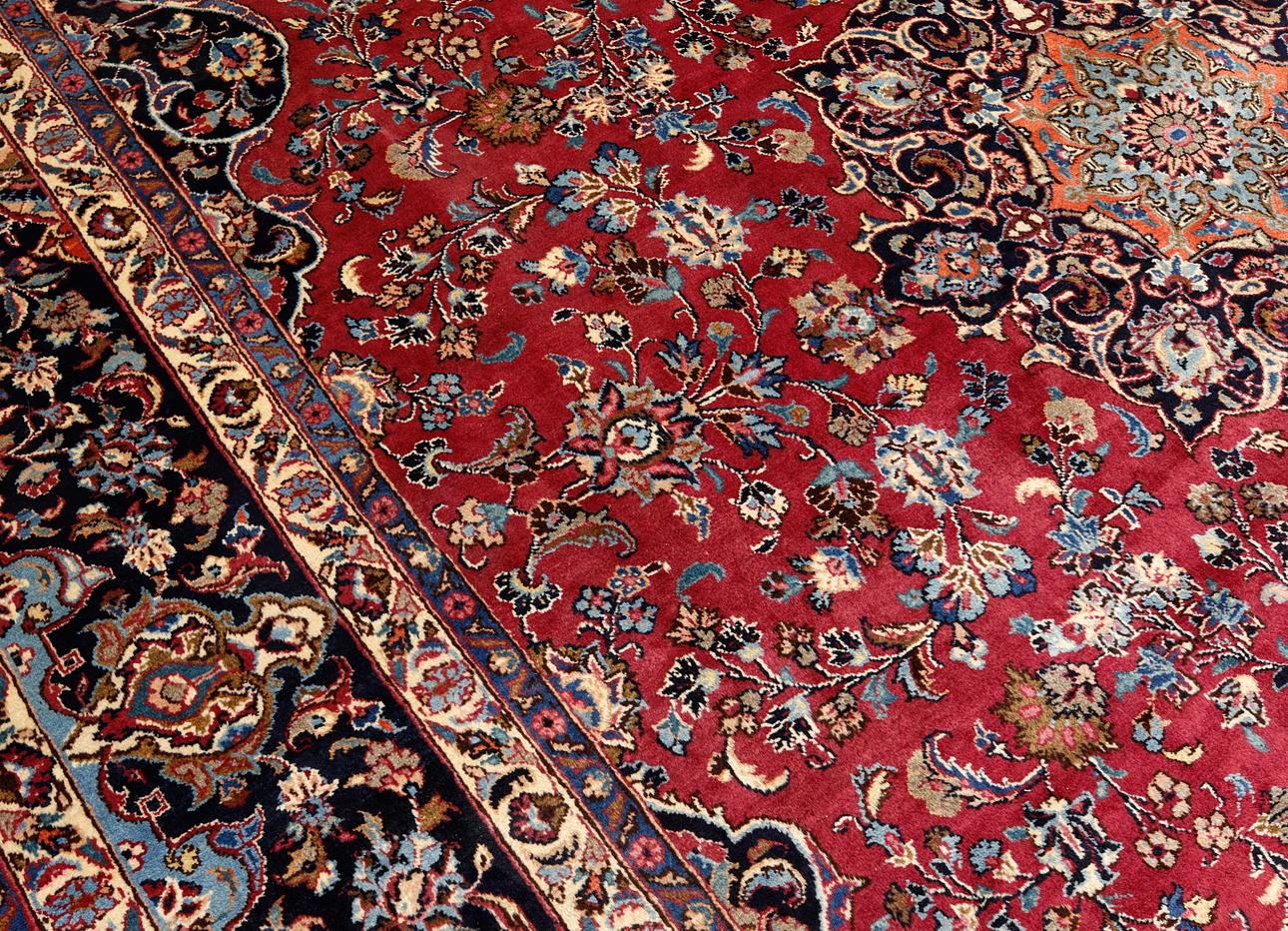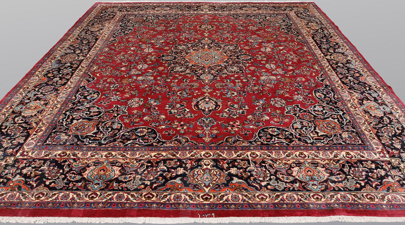 Main field in red base color decorated with center medallion, corner ornaments and palmette and arabesque wreath polychrome colors. Main border with dark base color and palmette and arabesque border. Polychrome colors.