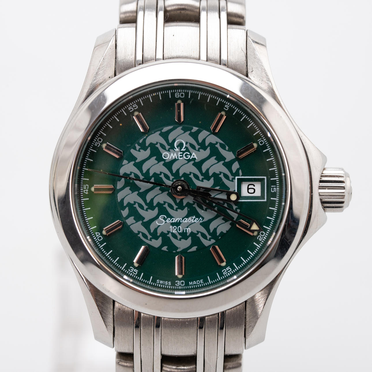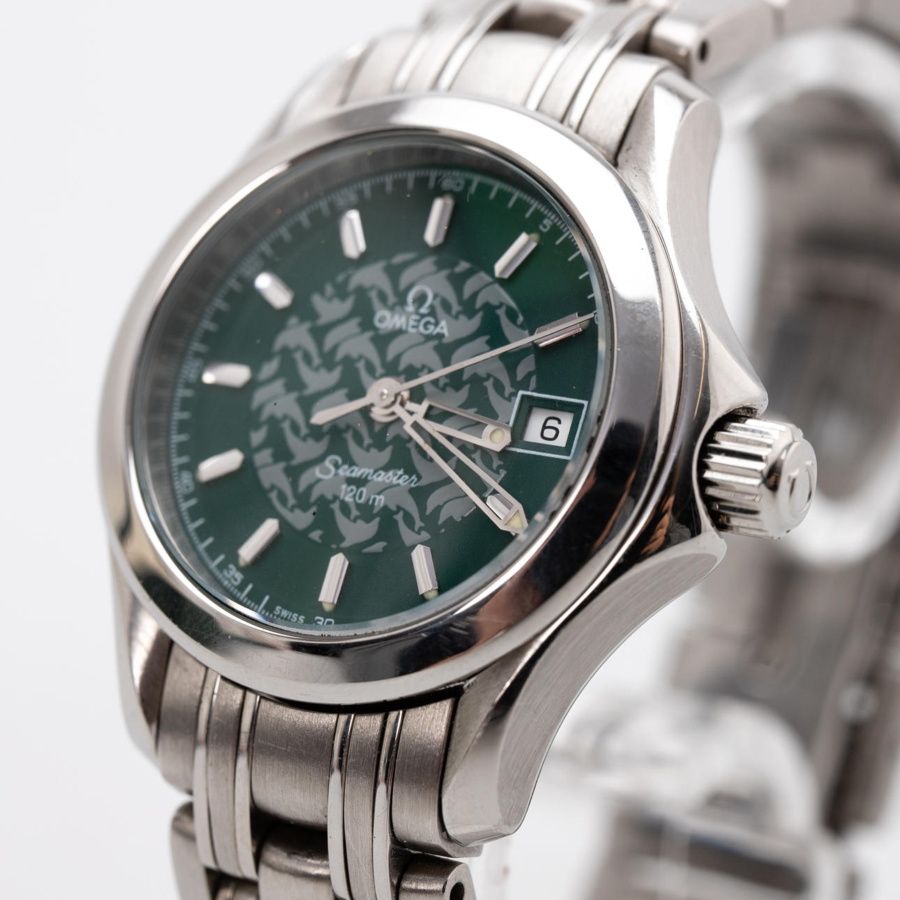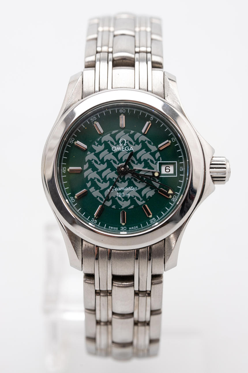Omega “Seamaster”, ref 25867000. Stainless steel case, green dial with hour, minute and second hand. Mineral glass, screwed case back, quartz movement, dimensions of the case diameter diameter approx. 27 mm, with original box and papers. The clock was running at the time of the review, Stockhoms Auktionsverk does not guarantee functionality.