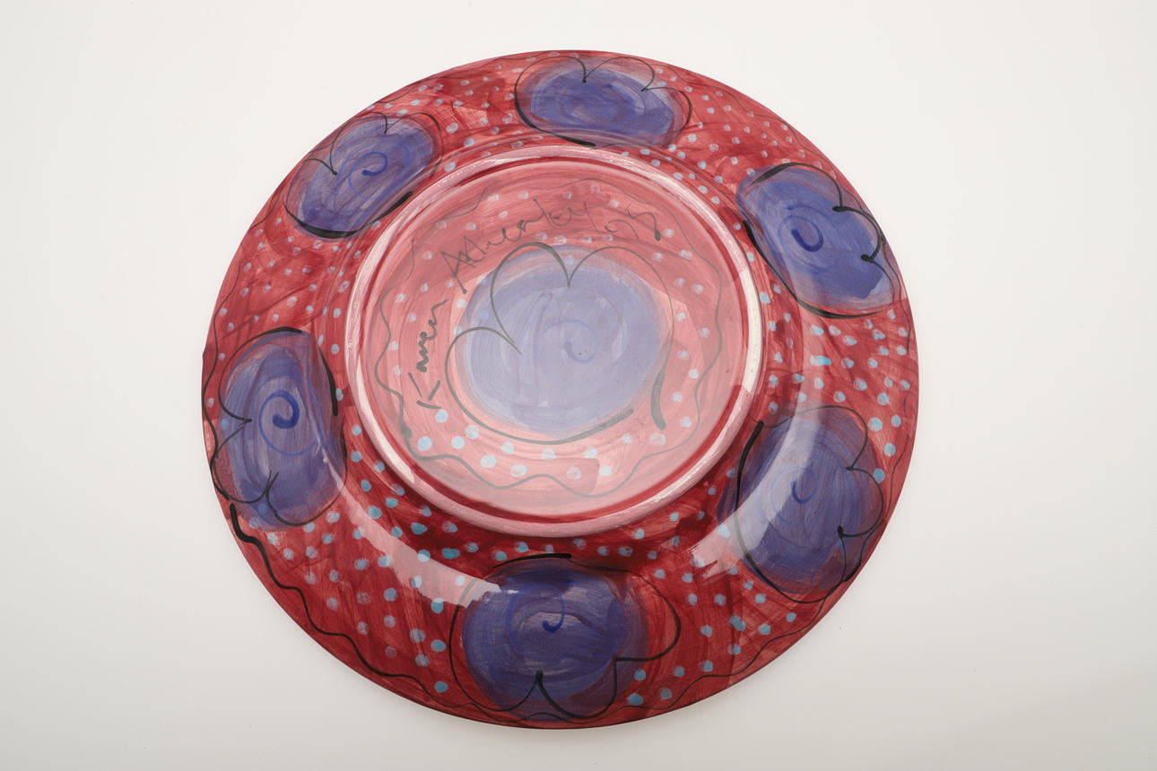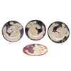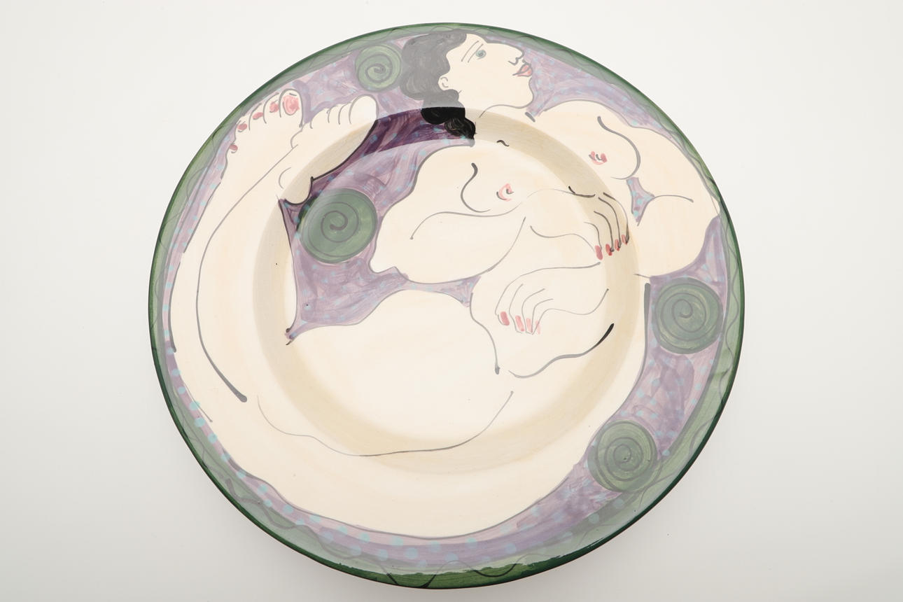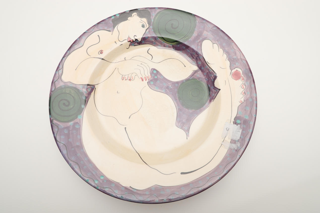 Four pottery glazed dishes by Karen Atherley, each with depictions of naked women on a coloured ground. Each signed and dated 95 and 96. 26cms diameter.
