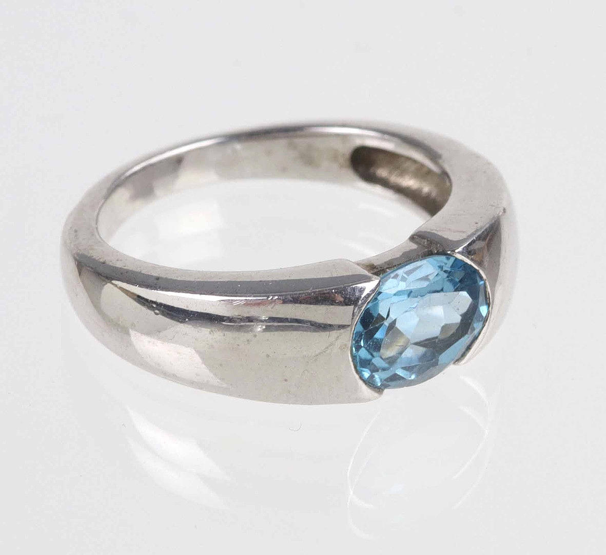 Blue topaz ring worked in 925 silver also hallmarked, slightly curved ring band this with an oval faceted blue topaz of approx. Set with 9 x 6 mm, ring size 58, weight 6 grams.