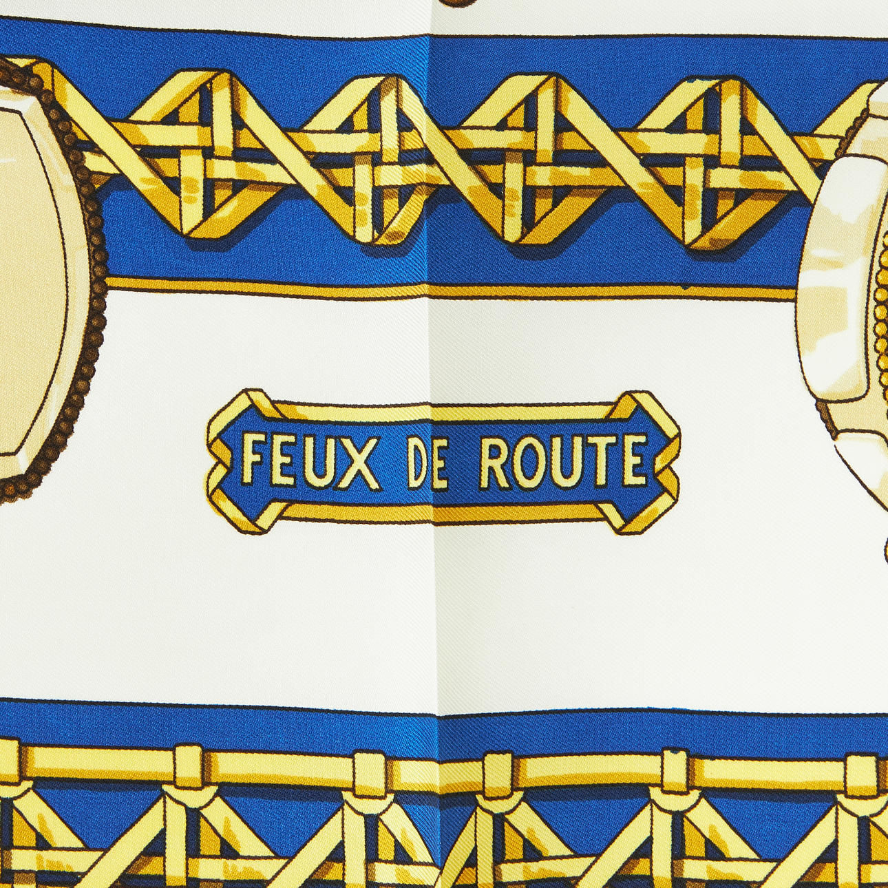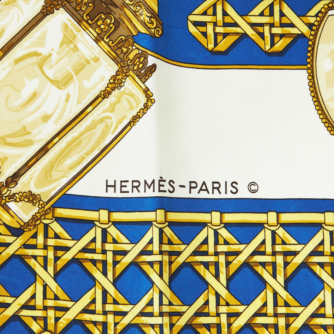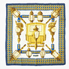Foulard side. Design by Caty Latham, 1971. Motif with carriage lamps against a cream white background and with a blue border. Tagged “HERMÈS-PARIS” and copyrighted. Approx. 90 x 90 cm.
