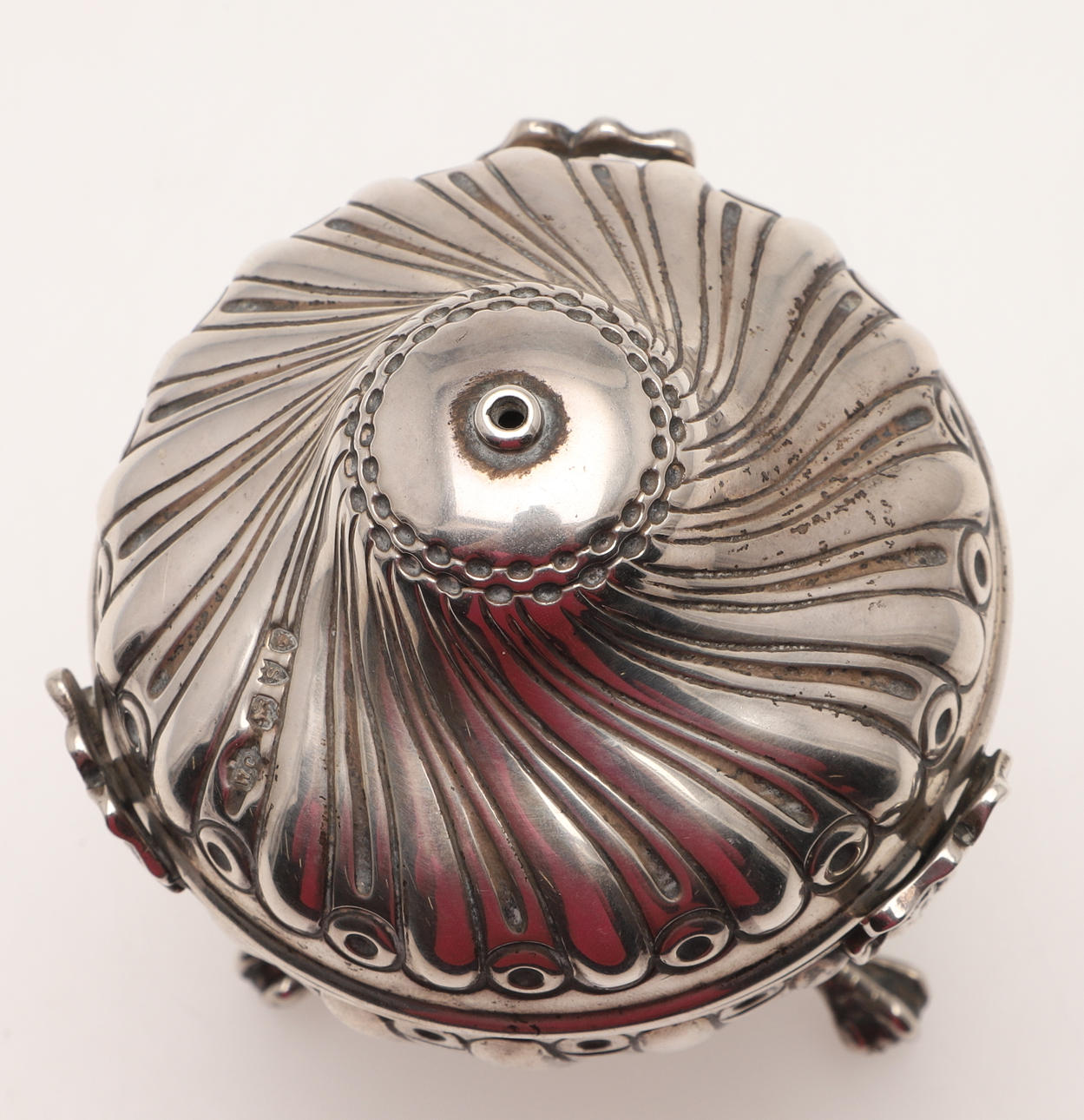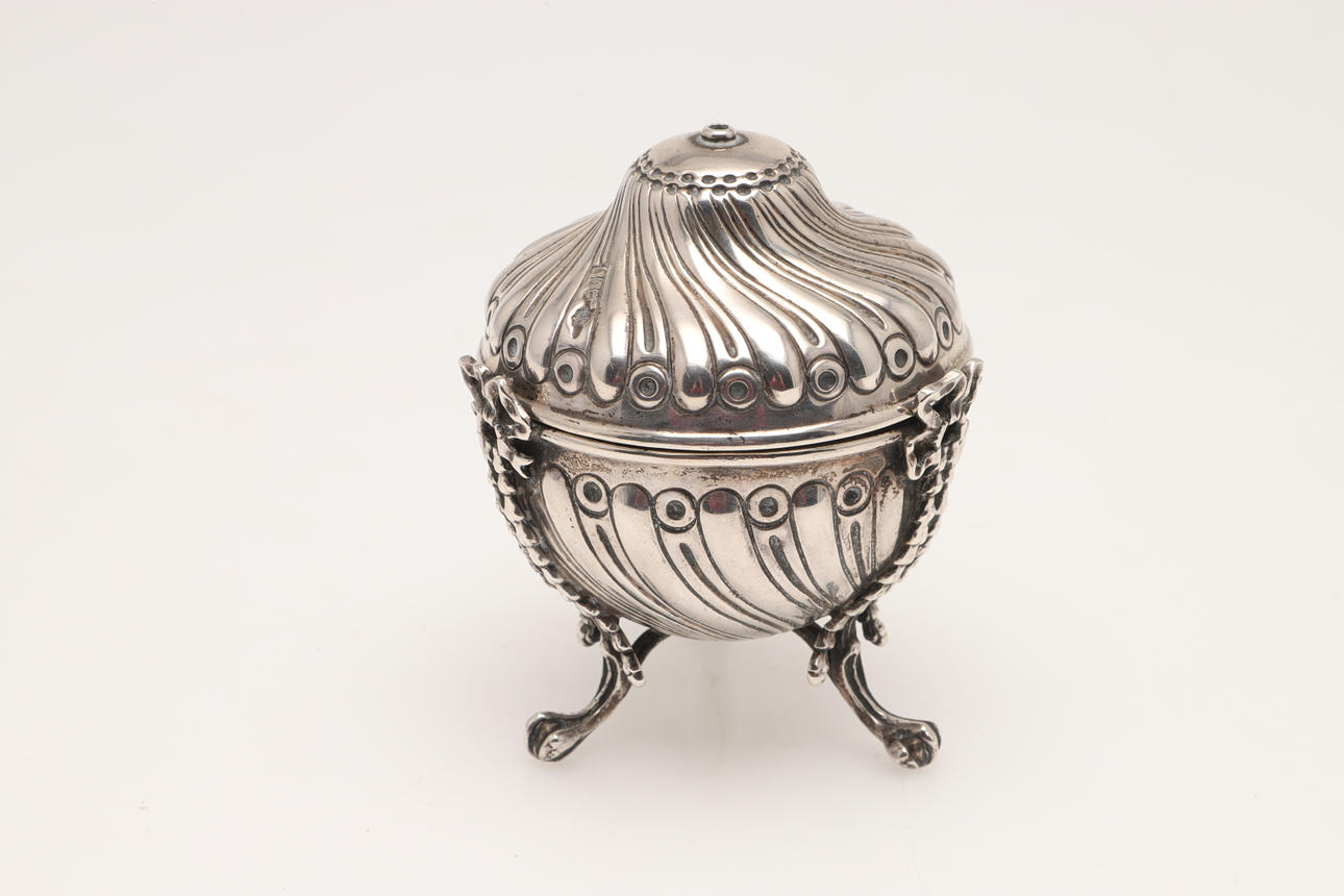 of circular form, with wrythen-fluted decoration, applied ribbon surmounts and raised on three ball & claw legs, by William Comyns & Sons, London 1893; 4" (10.2cm) high; 5.4ozt.