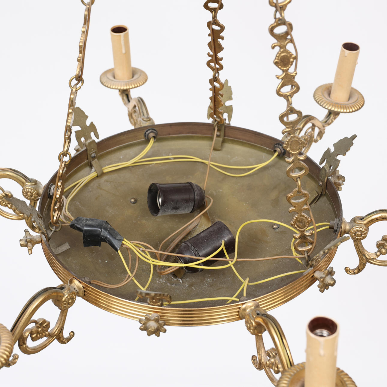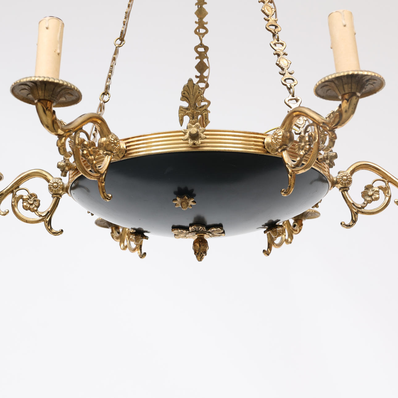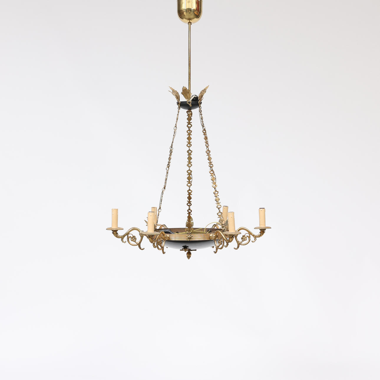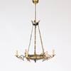 8 light points, frame in yellow metal, partly lacquered. Diameter 66 cm, height 104 cm.