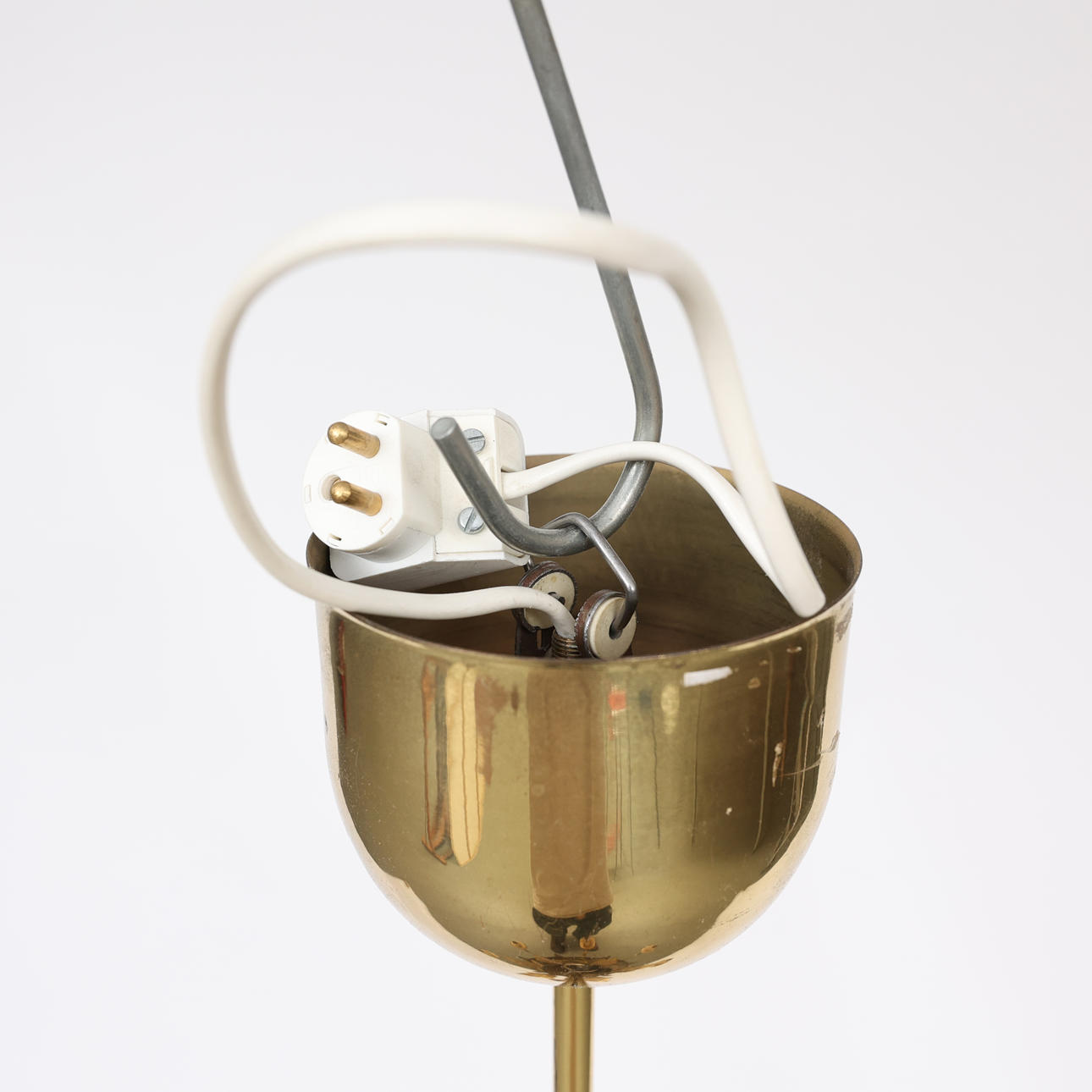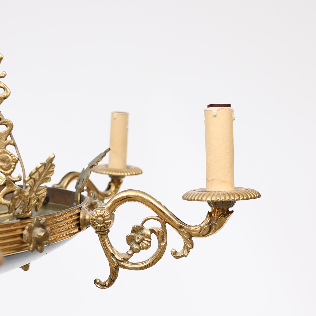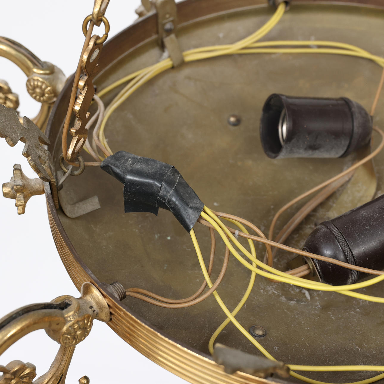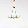8 light points, frame in yellow metal, partly lacquered. Diameter 66 cm, height 104 cm.