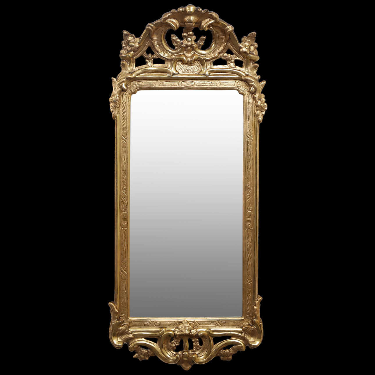 JOHAN ÅKERBLAD (1758-1799) Mirror maker Stockholm. Stamped IÅ under crown c. 1770. Openwork crown and woodcut decor. Original gilding without damage. The glass 19th century, back cover original.