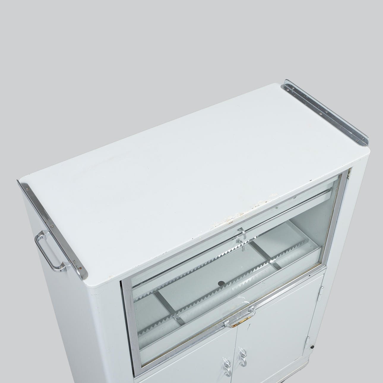 On wheels. Grey-lacquered metal. Folding sliding glass door with rear drawers and compartments. Pair of doors at the bottom. Noticed. Width approx. 81 cm, depth 39 cm, height approx. 109 cm.