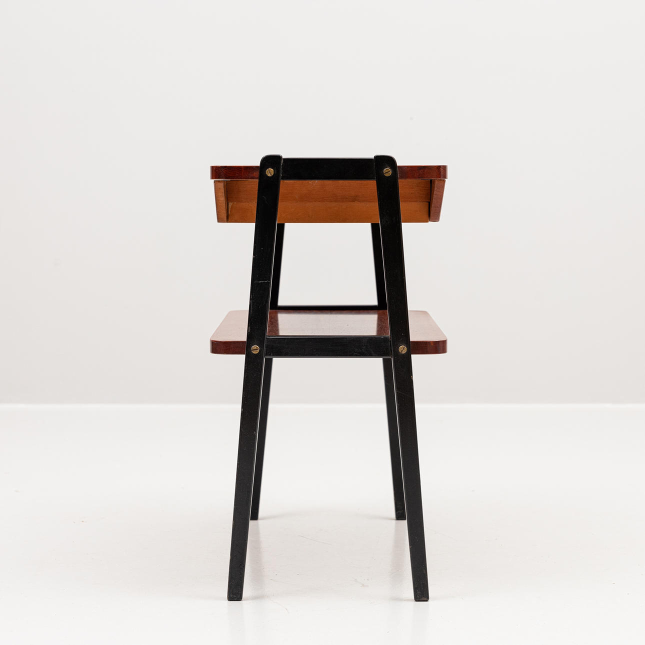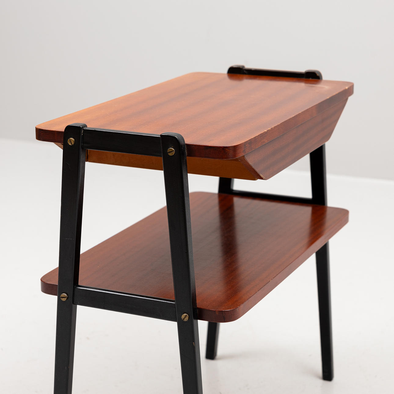 Stool with green upholstery, height 38 cm. Bedside table with box in sarg, mahogany veneer row with blackened legs, length 60, width 32, height 59 cm.