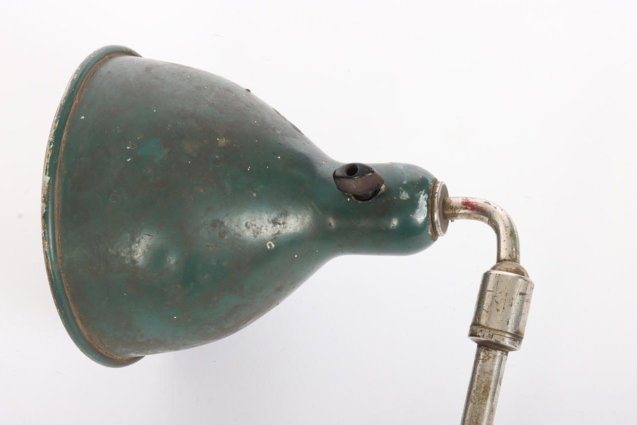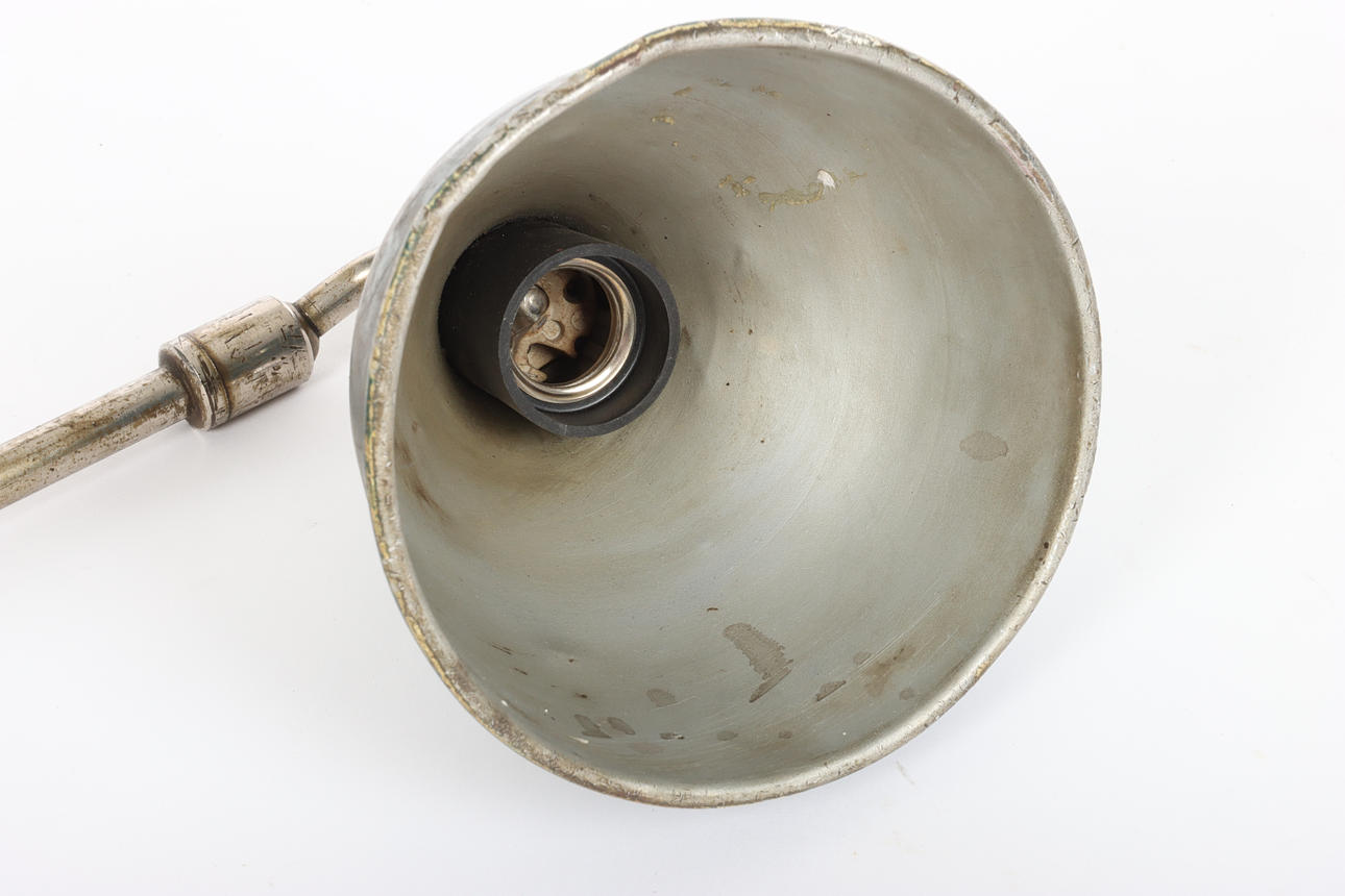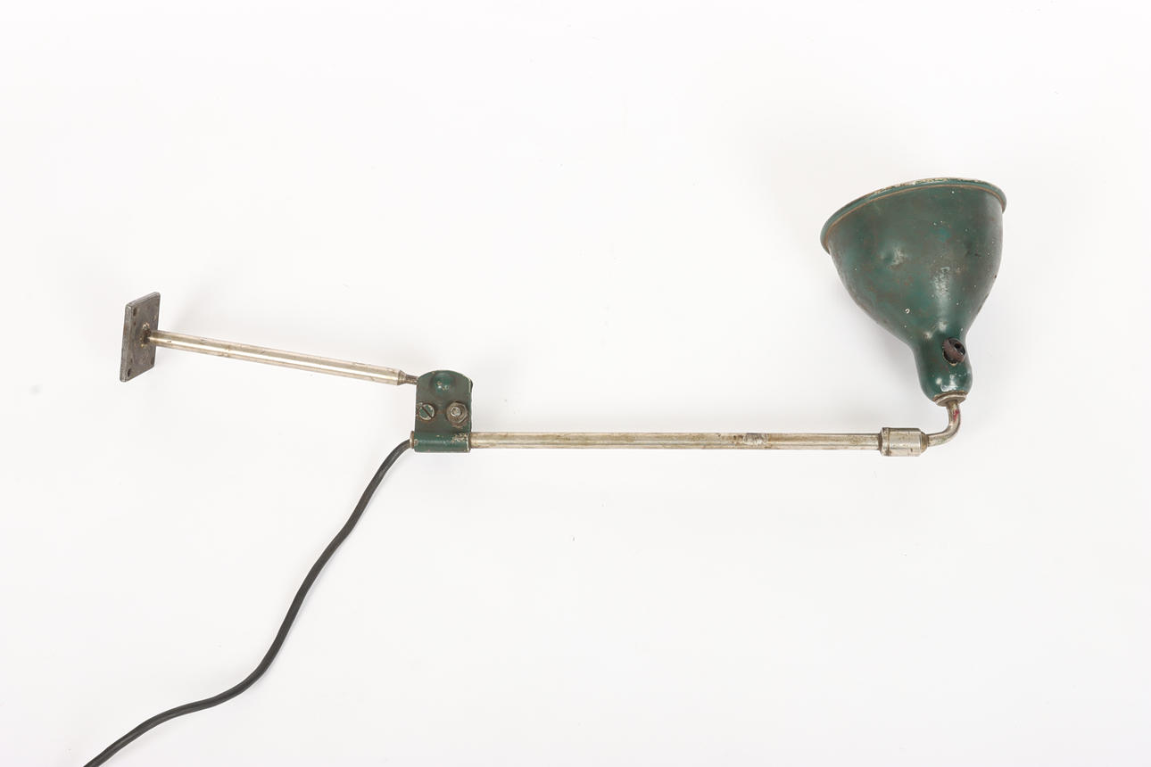 Lamp, steel, chrome-plated metal, adjustable screen in painted sheet metal. Iron bracket for wall or table. Bakelite switch. 1930s.