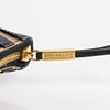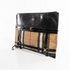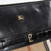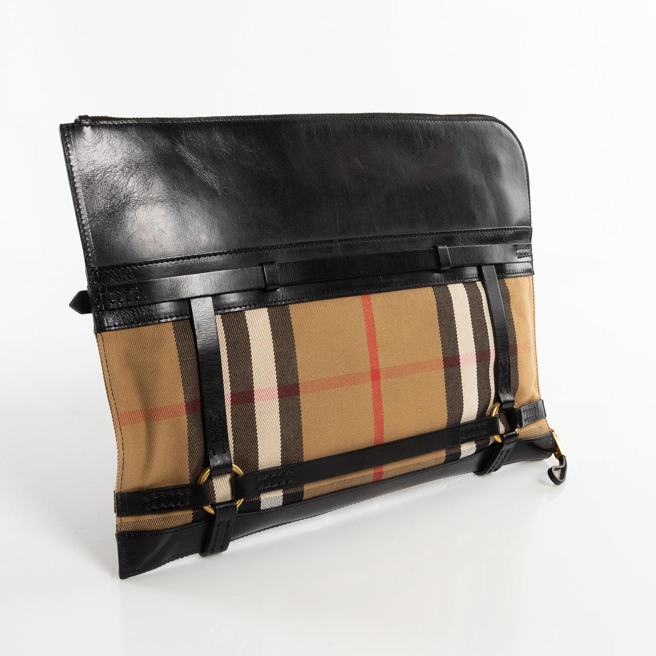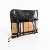 Portfolio in black leather and checkered canvas with details in brass-colored metal. Interior in black cotton canvas and black leather compartments for pens, etc. Zippered side compartment. Marked BURBERRY ESTABLISHED 1856.