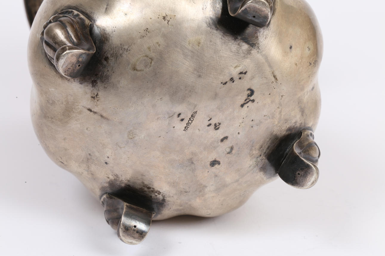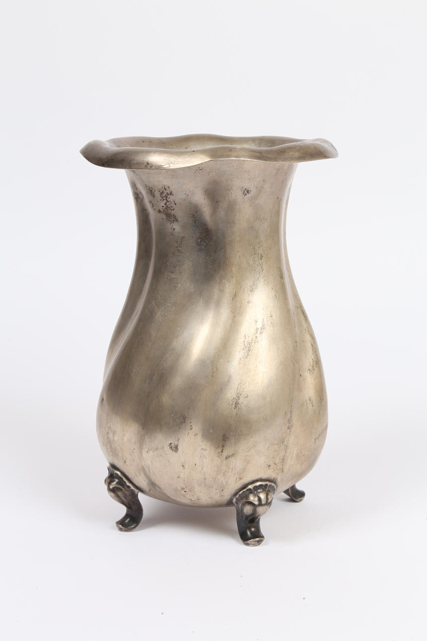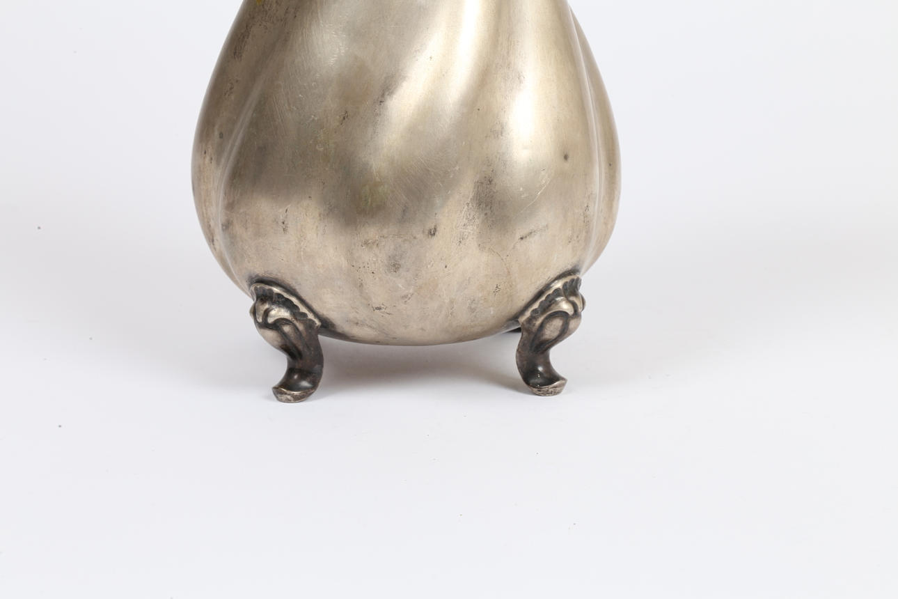 the flared rim above a swirled gadrooned bulbous body, raised on four scroll cast feet, 24.5cm high, 18.8oz.