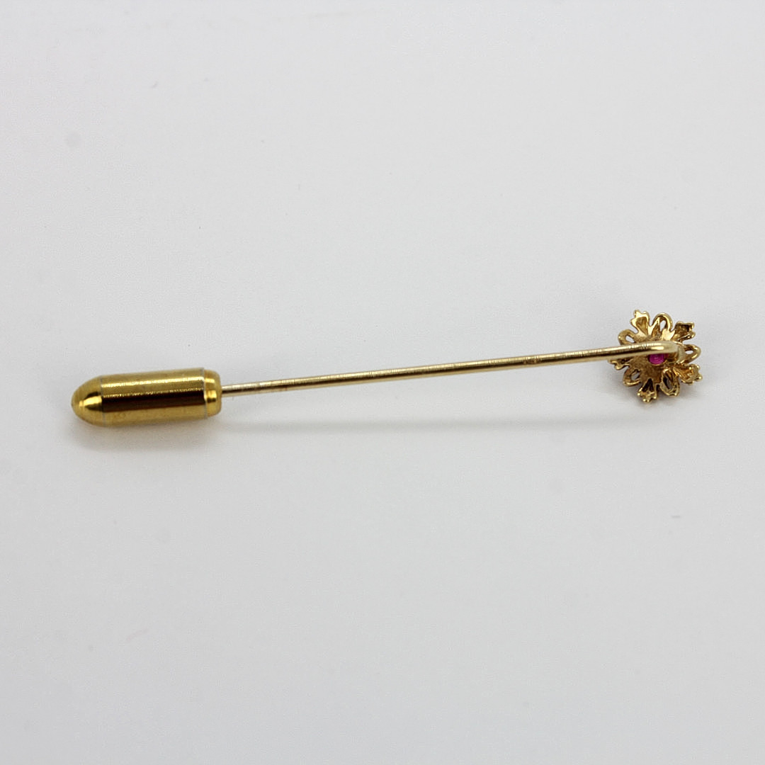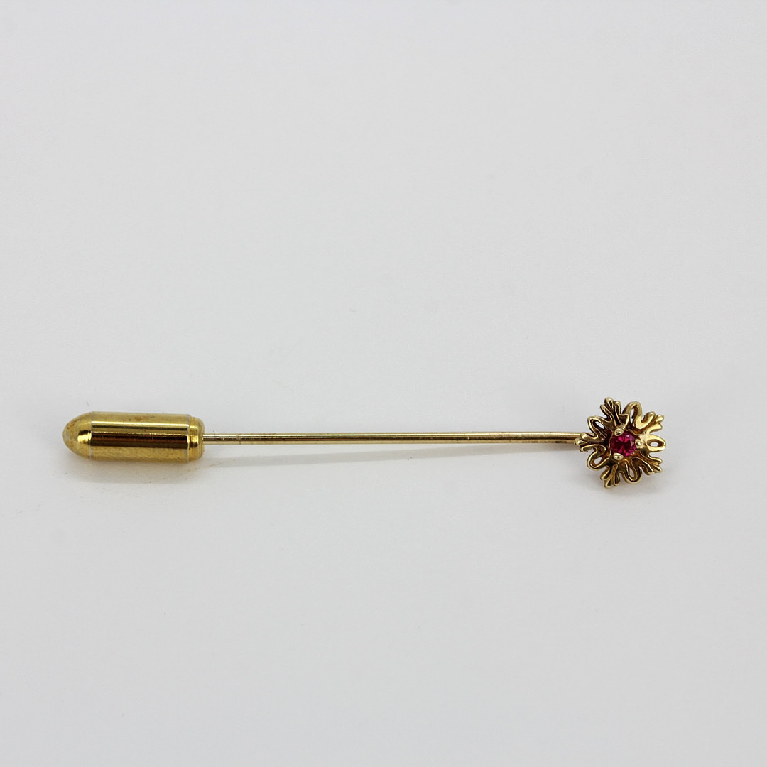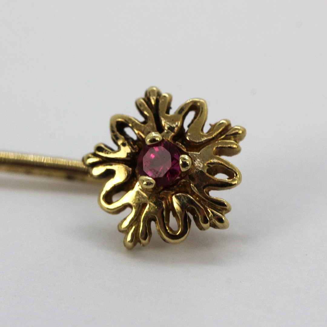 3859912. 9CT YELLOW GOLD AND RUBY PIN.