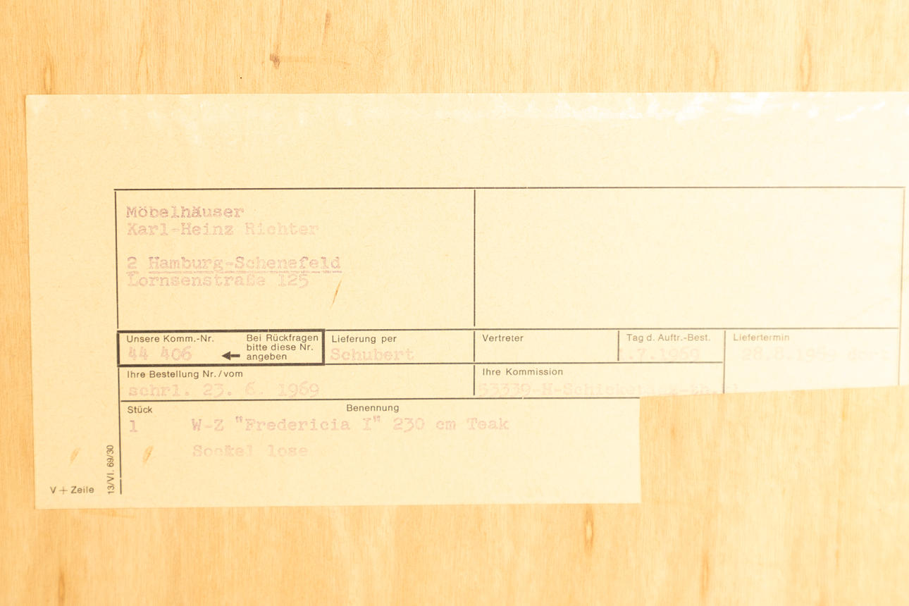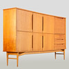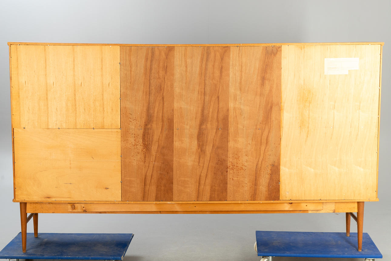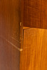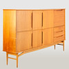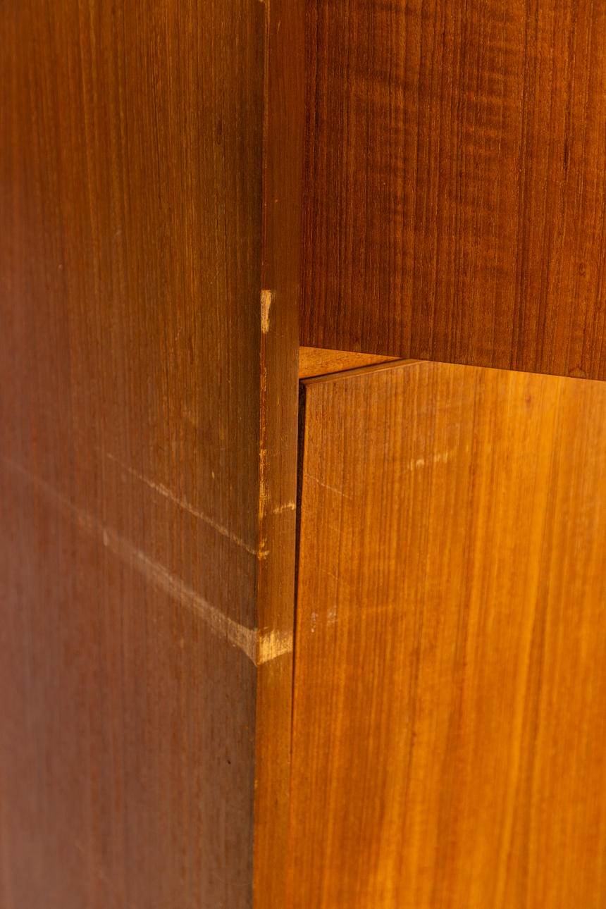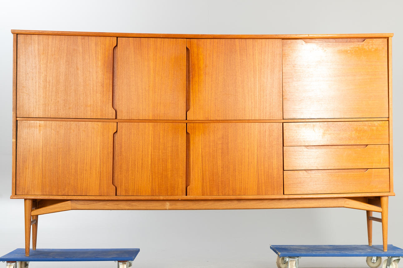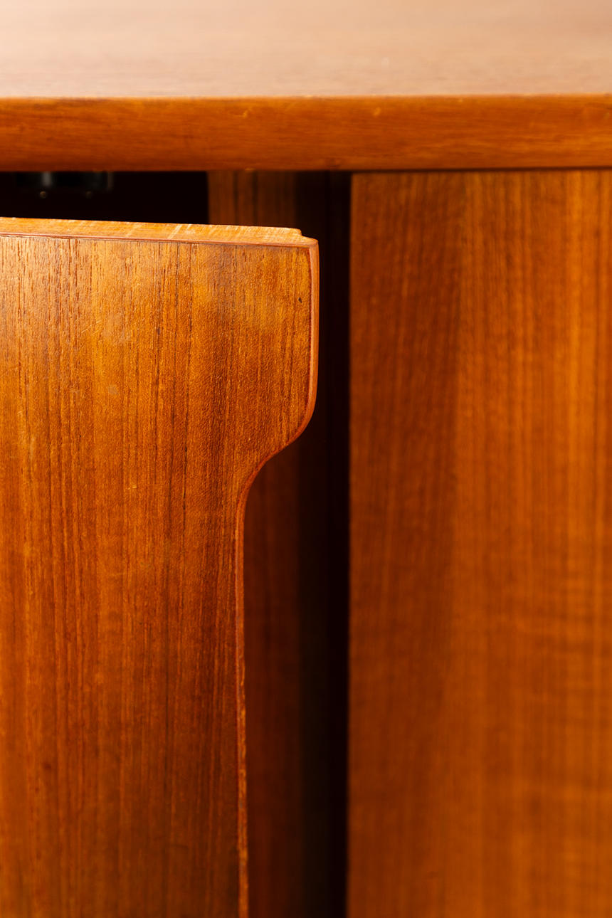 Teak sideboard with a rectangular body, with doors and double doors on the left, and with a hinged door and drawers on the right.