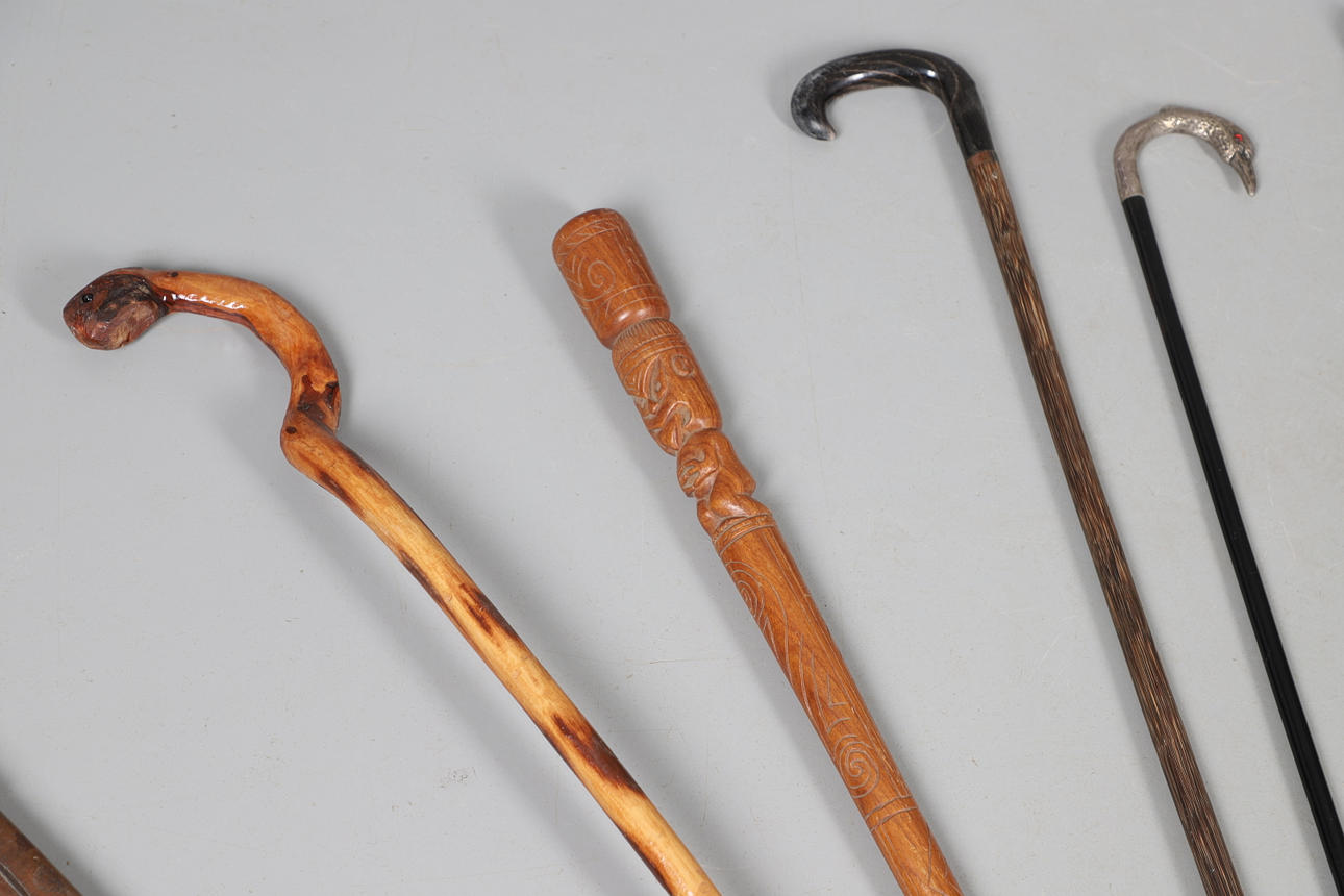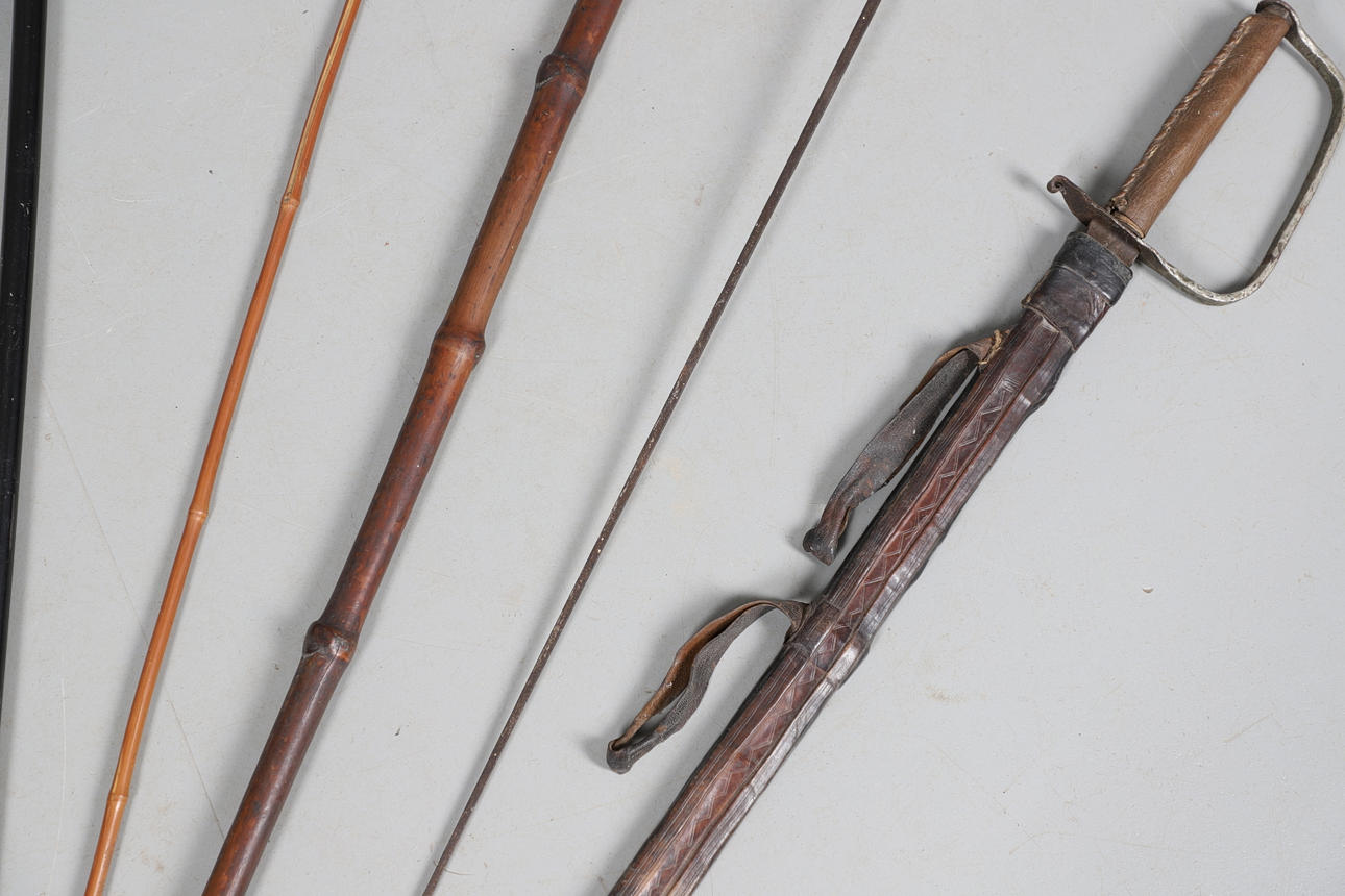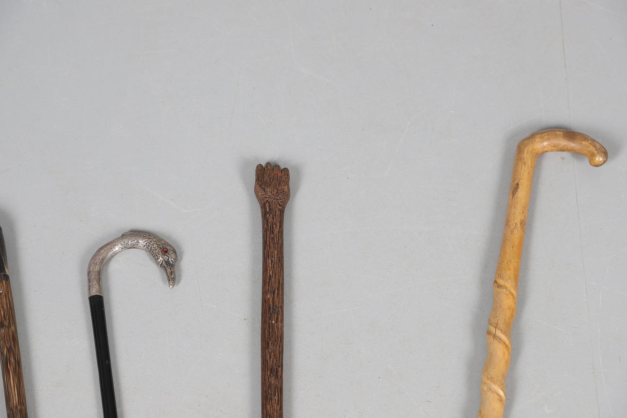 A mixed lot including a silver top walking cane in the form of a Swan (unmarked but pretty sure this silver), various walking sticks including some carved, sword in scabbard and loose scabbard etc.
