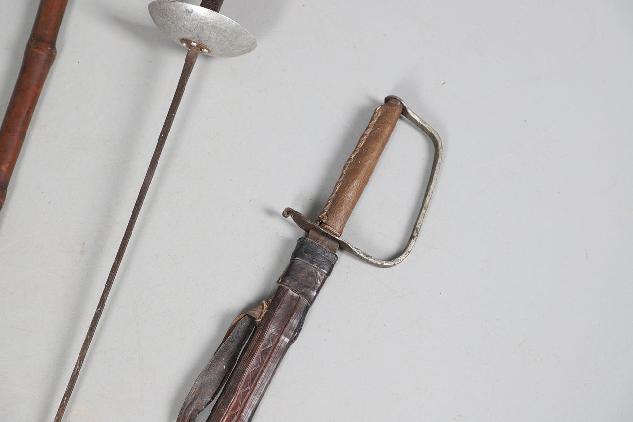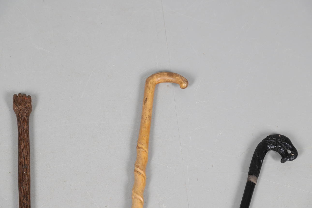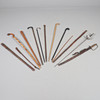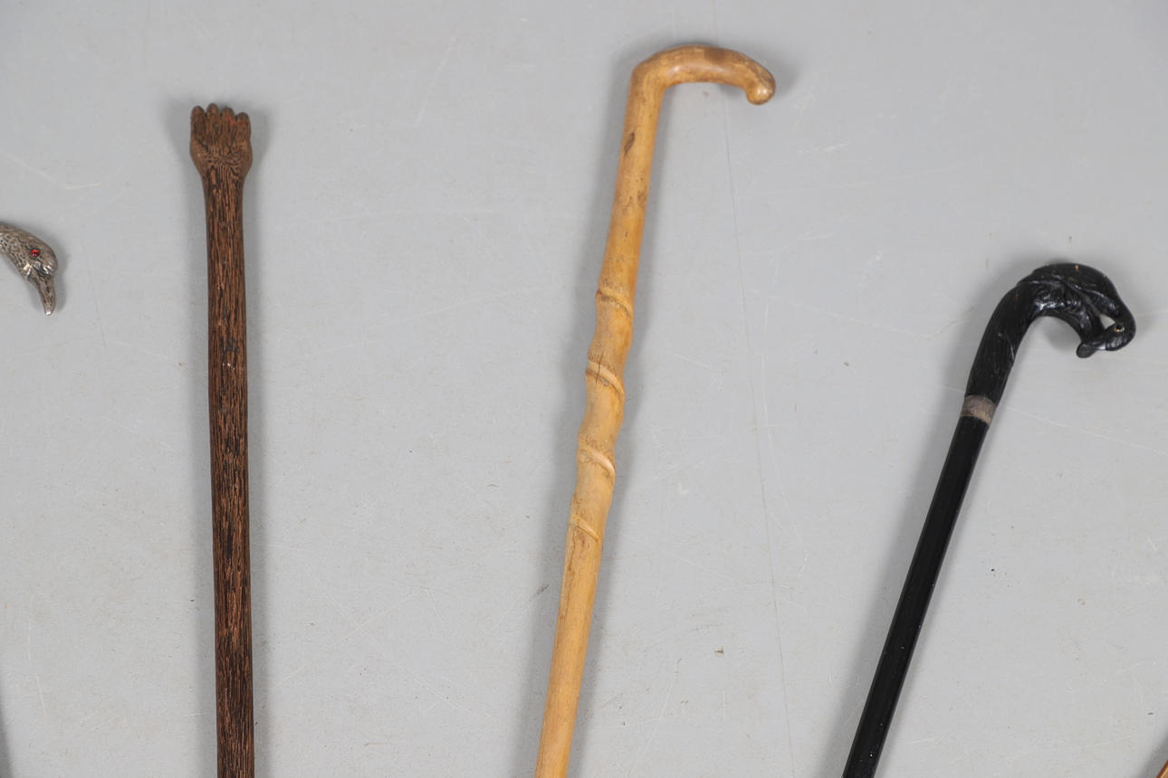A mixed lot including a silver top walking cane in the form of a Swan (unmarked but pretty sure this silver), various walking sticks including some carved, sword in scabbard and loose scabbard etc.