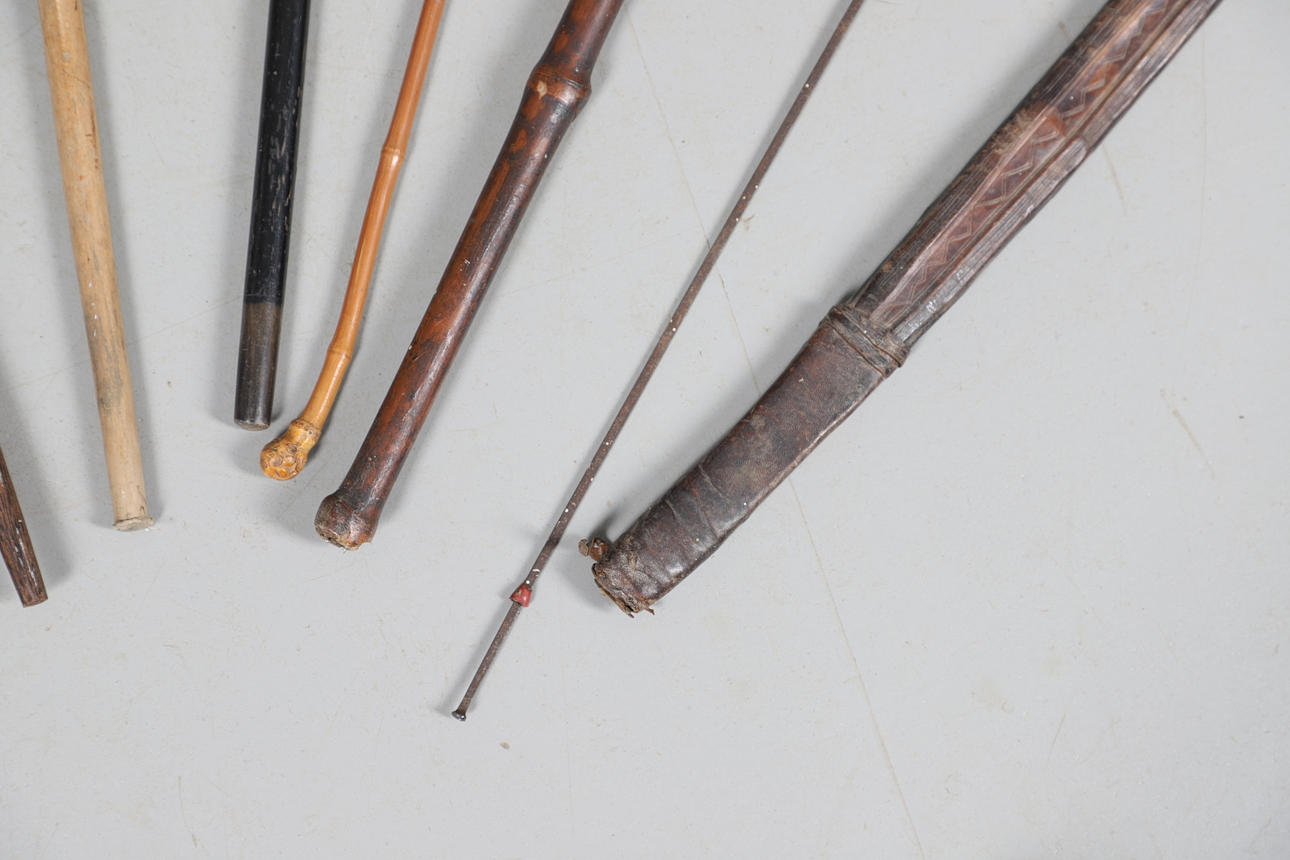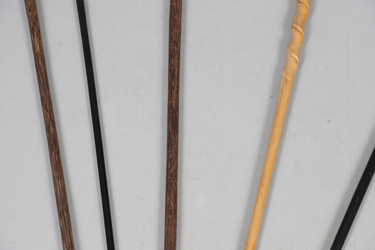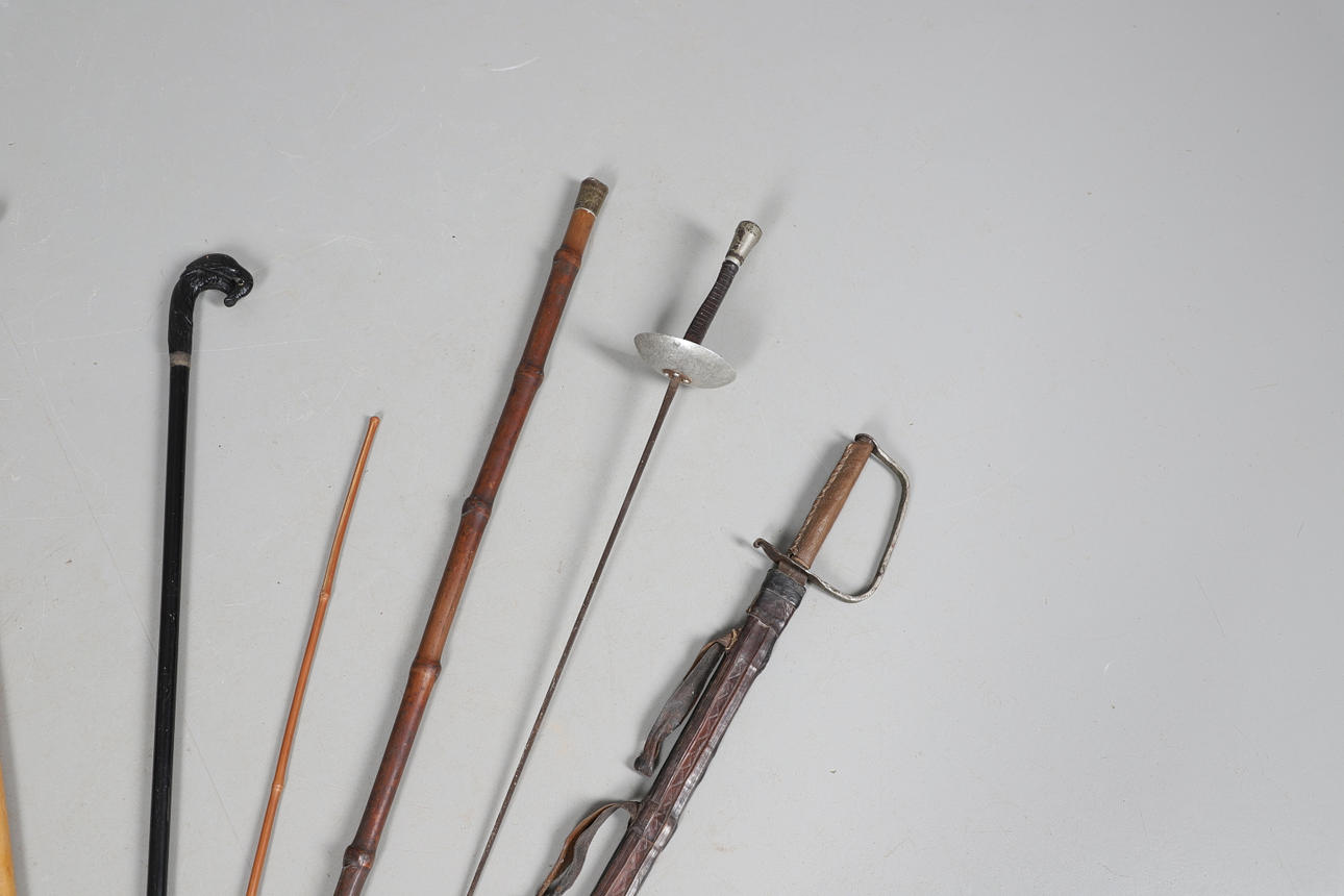 3861080. SILVER TOP WALKING CANE & VARIOUS WALKING STICKS & SWORD.