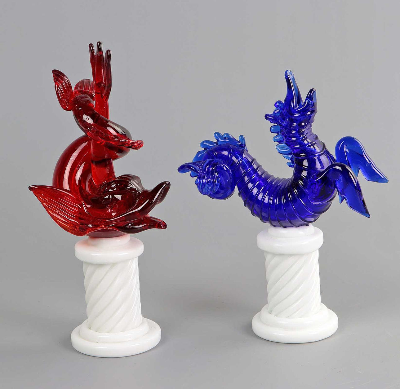 hand-blown, mythical creature in somewhat stylized form, dolphin with red trident and seahorse made of blue glass, each on a white opaque base in twisted design, H ca. 16.5 and 18.5 cm.