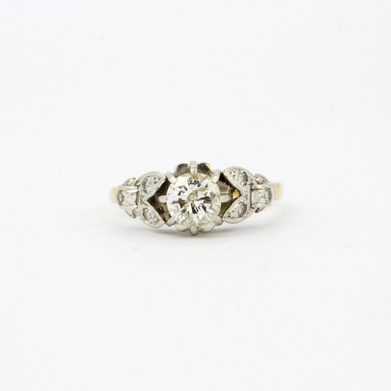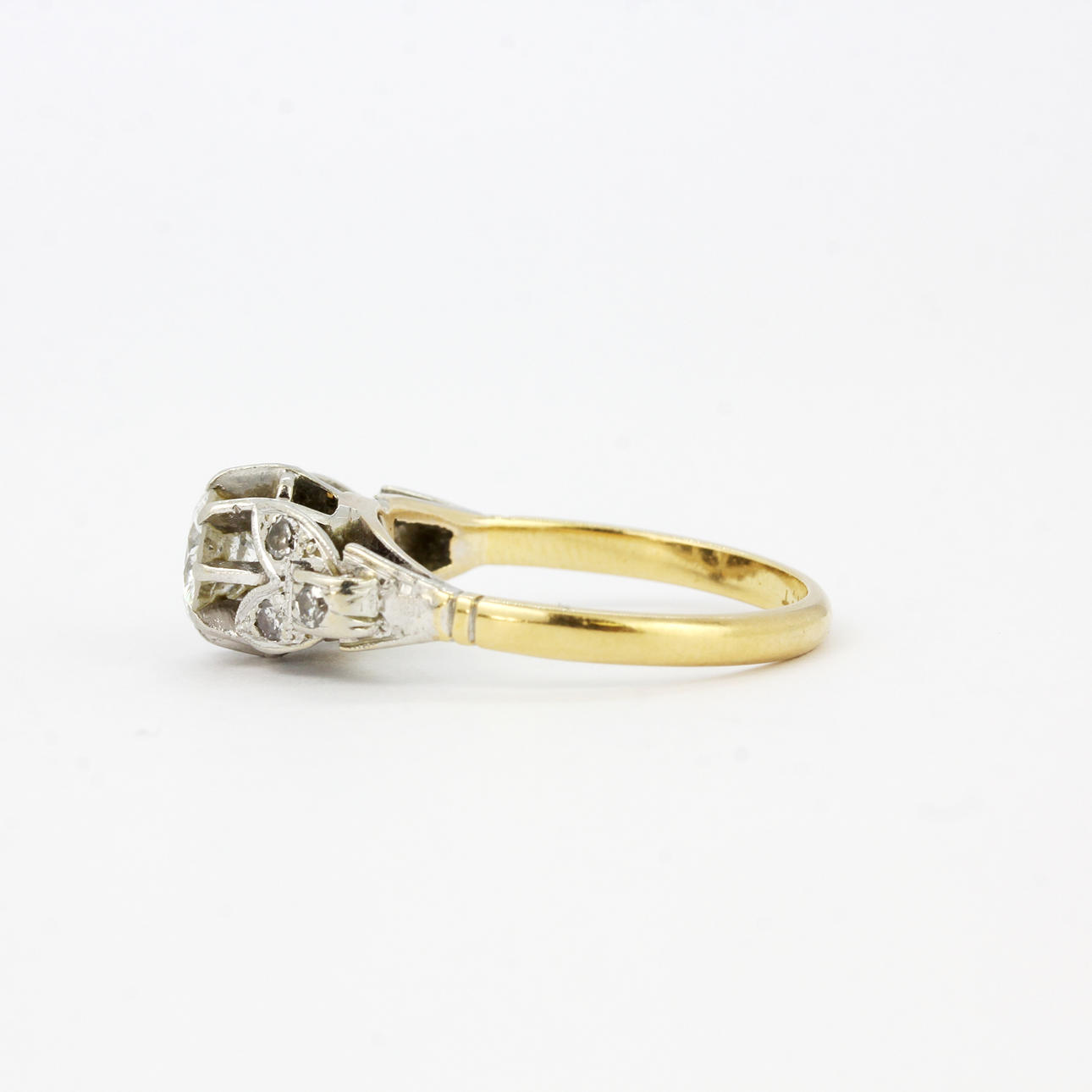 An 18ct yellow gold and platinum solitaire ring set with an old brilliant cut diamond, approx. 0.65ct, clarity P, colour I-J, and diamond set shoulders, ring size N.